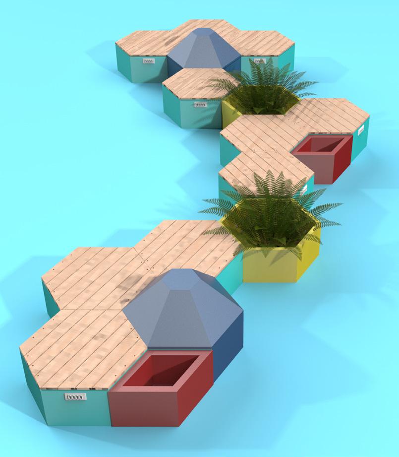“O Projeto HEXA se desenvolveu como um mobiliário urbano modular com intuito de criar novos ambientes para descanso e socialização que pudesse agregar a áreas pouco visitadas da cidade universitária UFRJ, sendo de fácil fabricação, sustentável e com proposta de biofilia”