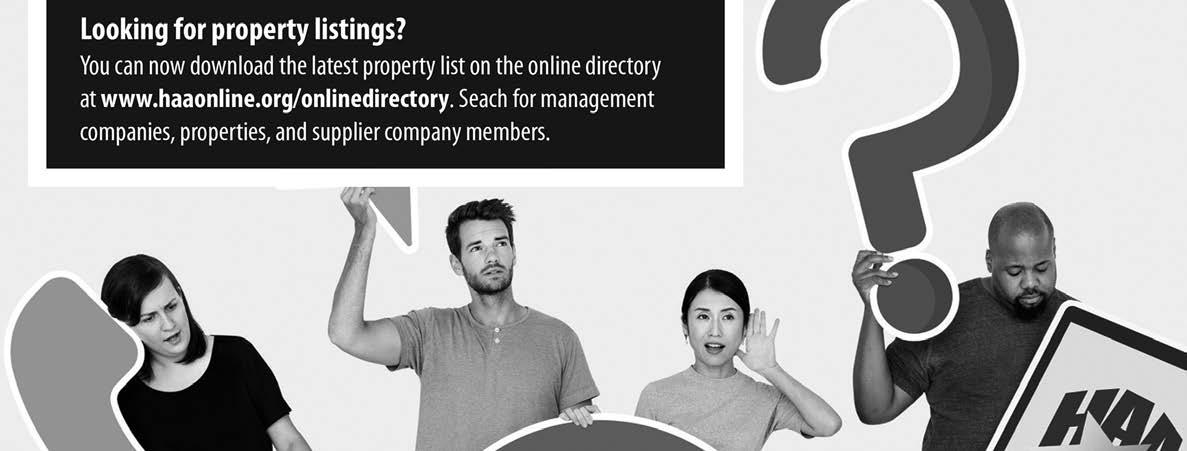 HAA IS REACHING OUT to better serve our members by bringing targeted networking and educational events to different parts of our 12-county service area. Contact HAA’s Education and Outreach Department at education@haaonline.org to sign up for these FREE, management-only events where you can learn about issues affecting your area and network with your fellow managers. Want to host an event? We are looking for member properties to host a Region Meeting. Contact education@haaonline.org.
