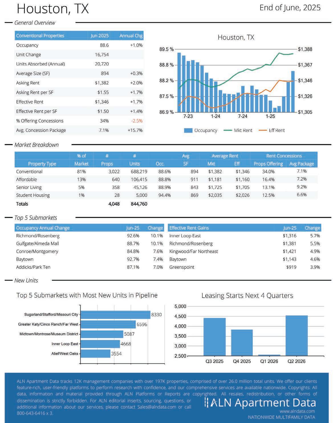 • Oak Leaf Mgmt Co: The Verve Apartments, 56 units at 3201 Garth Rd in Baytown; Whispering Oaks, 140 units at 1200 N Loop 336 W in Conroe; Cambridge Village, 303 units at 12945 S Post Oak Rd; and Vail Apartments, 60 units at 1015 Gunnison St in Sealy.