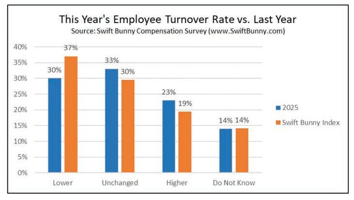 Negatively, 35% of respondents require at least a 90-day waiting period before employees can use PTO. Also, 31% do not permit PTO to be carried forward (much higher than the Swift Bunny Index); possibly not permitting carrying forward PTO is done to motivate its use. 43% allow one to two weeks to be carried forward.