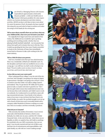 yan Terrell is a Managing Director with Greystar, responsible for approximately a third of the Houston portfolio – a little over 65,000 units in Greystar’s third-party portfolio. He is also responsible for new business development and client relations activities. ABODE sat down with Ryan to learn more about his career, his passions (Fore!), the people who have inspired him along the way and what he hopes to achieve as he takes his swing as HAA’s leader for the coming year. Tell us more about yourself, where are you from, what was your childhood like, what were your formative years like? I’m originally from Sugar Land, born and raised in First Colony. My childhood was wonderful. I grew up doing anything and everything outside, whether that was playing football, baseball, basketball – my true passion has always been golf, and it remains that way to this day. Then I ended up spending the best four years I barely remember in Austin at the University of Texas, then immediately moved back to Houston to take a job working in the real estate industry. Tell us a little bit about your parents. Dad was a football coach then got into administration. Mom was a basketball, softball and volleyball coach. So, the discipline and hard work was instilled in me at a very young age. I can still hear my dad’s words echoing in my head, “If you’re earlier you’re on time, if you’re on time you’re late, and if you’re late, don’t show up.” So how did you start your career path? When I graduated from college, it was the end of the dotcom bust, and I thought I was going to be using my degree in government. I thought I was going to be a lawyer. I went to work for a law firm while I was still in college, hated it and realized, “Hey, I’ve got decent ‘BS’ skills and I’m pretty good at math, so maybe real estate is good for me.” But I also love golf, which means that residential real estate was out because they work weekends, and I didn’t want to work on weekends. So, I endeavored to try and find a career selling commercial real estate. I have family in the industry – many of you may or may not know that Stacy Hunt is my mom’s brother, my uncle. He was kind enough to set me up with a bunch of interviews and I eventually landed with a company called Hendricks & Partners working as an assistant, then as an analyst, and then eventually, a producer. What led you to Greystar? Well, necessity, the mother of invention. I was in investment sales with Hendricks & Partners, which is now Berkadia, for a little over six years, until the GFC (Global Financial Crisis). At the end of the day –when there was no liquidity, no debt, no capital to buy, sell, build or anything – for somebody who was 100% commission, that was not good. I was recently married and had a lot of bills to pay and had a lot of commitments and responsibilities, and, quite frankly, my wife told me I wasn’t making enough