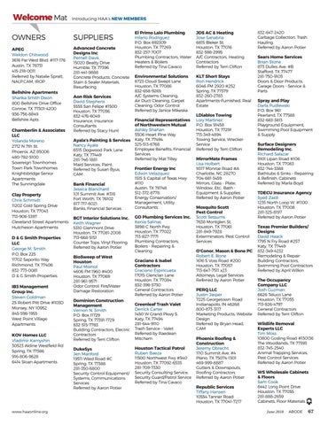 JDS AC & Heating Jose Sanabria 6815 Bleker St. Houston, TX 77016 832-598-2995 A/C Contractors, Heating Contractors Referred by Terri Clifton KLT Short Stays Ron Hendrick 6046 FM 2920 #252 Spring, TX 77379 832-260-2783 Apartments-Furnished, Real Estate LDiablos Towing Lory Martinez P.O. Box 91458 Houston, TX 77291 713-349-4894 Towing Service, Wrecker Service Referred by Terri Clifton MirrorMate Frames Lisa Holbert 9317 Monroe Road #A Charlotte, NC 28270 704-681-3459 Mirrors, Glass - Plate, Window, Etc., Bath Equipment & Supplies Referred by Aaron Potier Mosquito Scott Pest Control Scott Sessums 7638 Montglen St. Houston, TX 77061 281-849-7928 Exterminators, Pest Control Services O’Conor, Mason & Bone PC Robert E. Bone 1616 S Voss Road #200 Houston, TX 77057 713-647-7511 x23 Attorneys, Legal Services Referred by Aaron Potier PERQ LLC Justin Jasper 7225 Georgetown Road Indianapolis, IN 46268 800-873-3117 Marketing Products, Website Design Referred by Bryan Head, CAM Phoenix Roofing & Construction Jeremy Obrecht 1110 Summit Ave. #4 Plano, TX 75074-1301 469-999-8887 Gutters & Downspouts, Roofing Contractors Referred by Aaron Potier Republic Services Tiffany Hansen 10554 Tanner Road Houston, TX 77041-7217