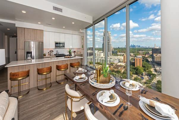 When you open your apartment door, you can find floor to ceiling glass giving you a view of the roaring city. Units come with latch smart technology-controlled access systems, Nest thermostats and high-end Bosch appliances. The natural stone countertops, mud room entryways, freestanding soaking tubs, touchless faucets and marbled fireplaces showcase the attention to detail Aspire Post Oak has.