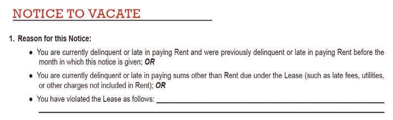 The Notice to Vacate form identifies three scenarios in which a Notice to Vacate may be given. In court you should be prepared to explain why you selected the Notice to Vacate form.