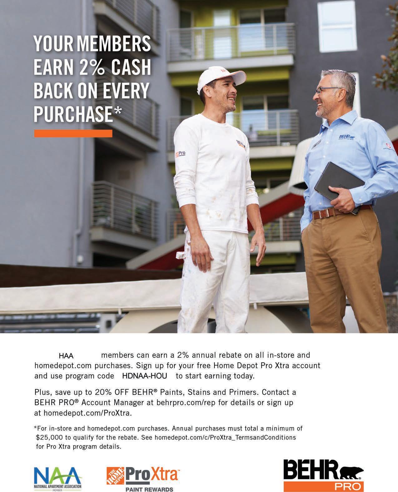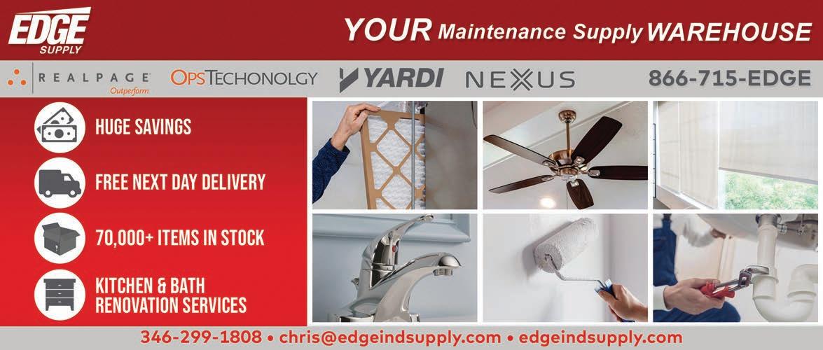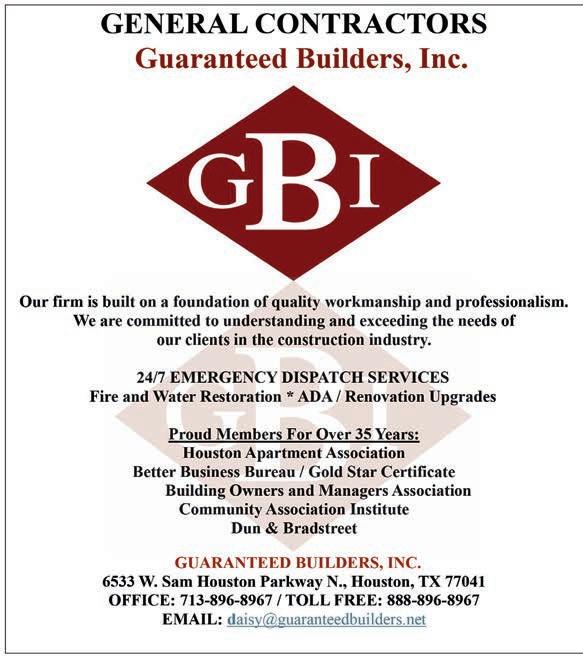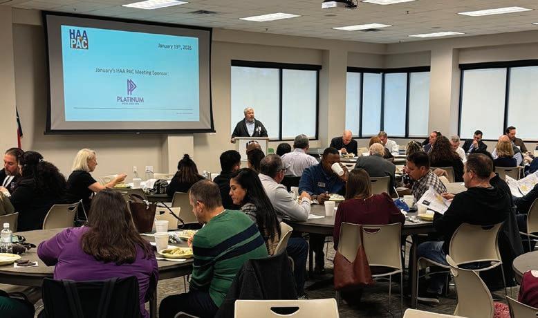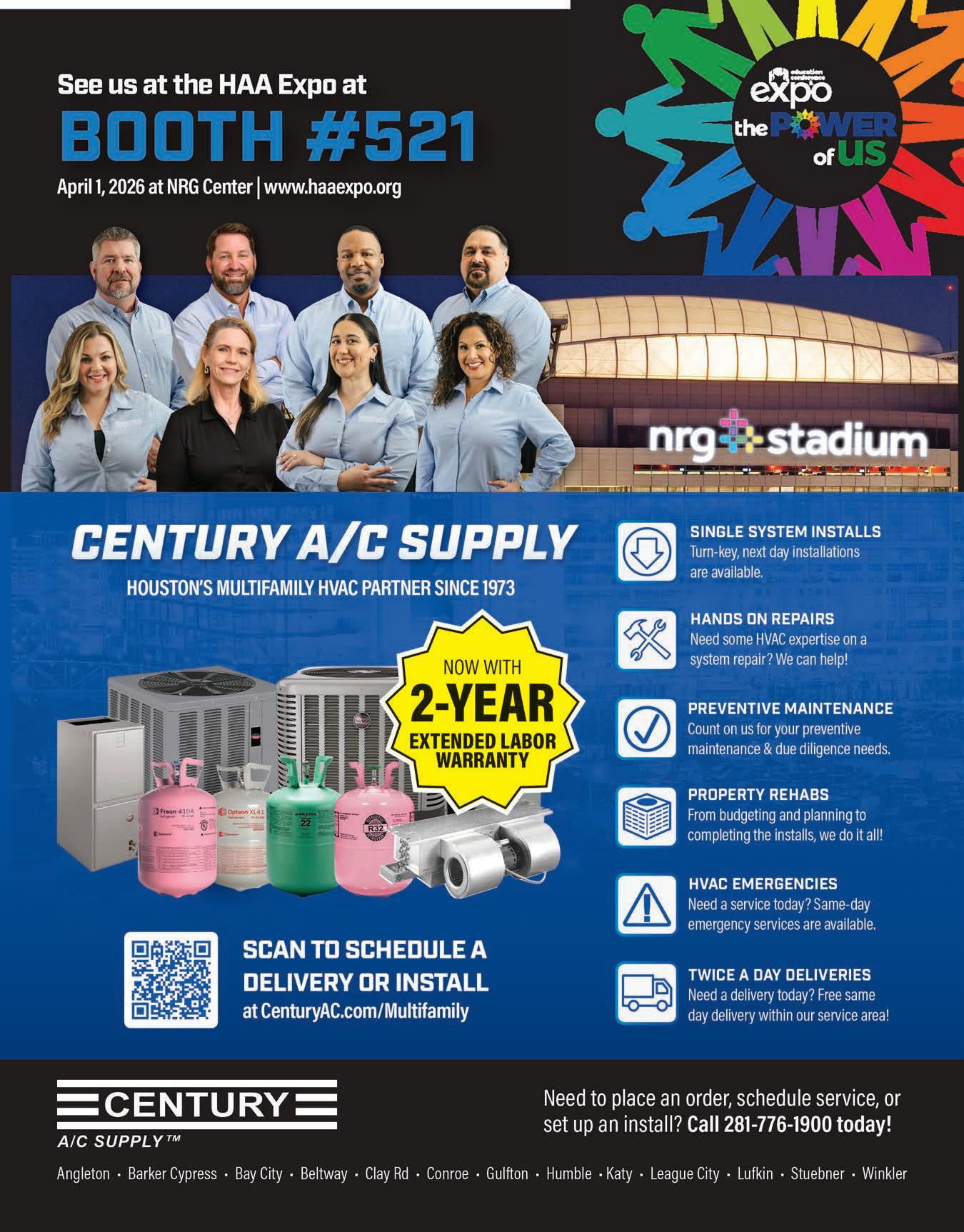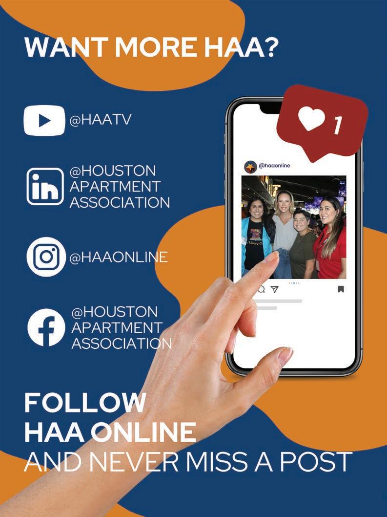 HOUSTON APARTMENT ASSOCIATION MISSION AND VISION: HAA is the leading advocate, resource and community partner for quality rental housing providers in the Houston and surrounding area. HAA develops leadership in the multifamily industry by engaging broadly diverse membership, embracing effective technology and advocating for a geographically inclusive association. ABODE IS THE OFFICIAL PUBLICATION OF THE HOUSTON APARTMENT ASSOCIATION serving the multihousing industry in Austin, Brazoria, Chambers, Colorado, Fort Bend, Harris, Liberty, Matagorda, Montgomery, San Jacinto, Waller and Wharton counties. ABODE, MARCH 2026, VOLUME 49, ISSUE 3