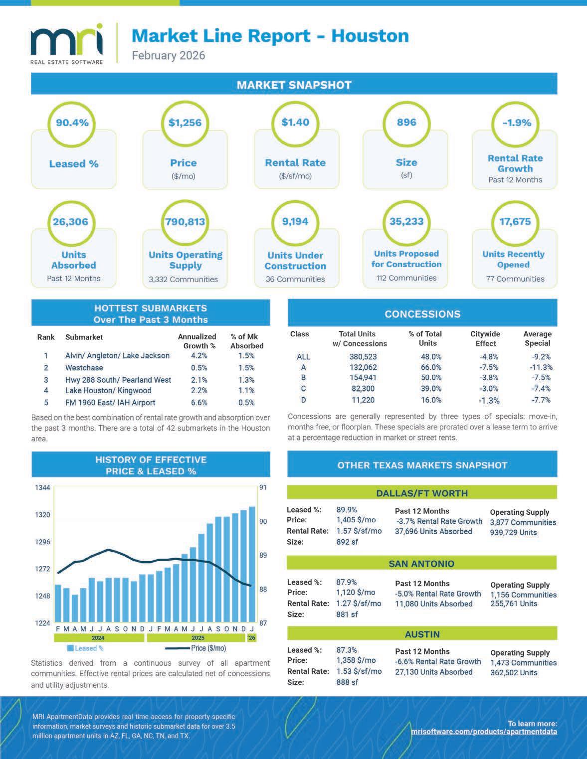 • The Lynd Company: Falls of Gessner, 424 units at 3230 S Gessner Rd; Falls of Town Park, 294 units at 9303 Town Park Dr; and Falls of Parramatta, 560 units at 310 Parramatta Ln.