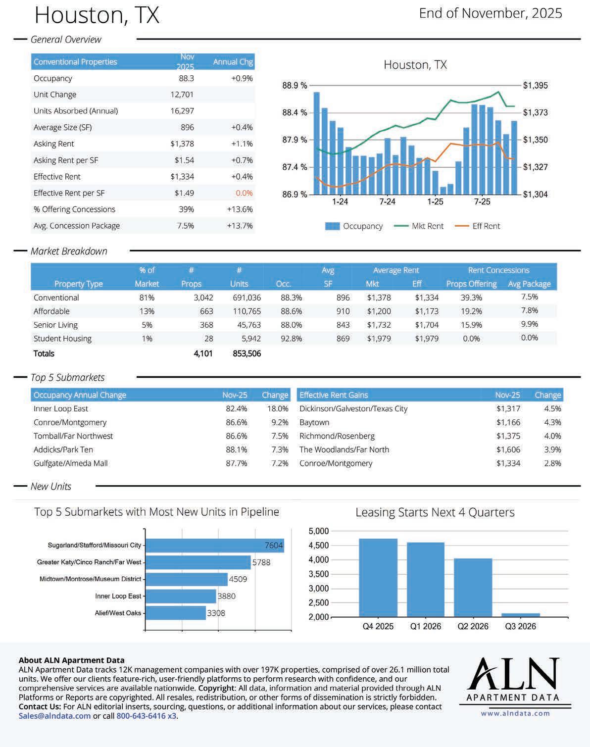 • Summit Property Management (SPCP): The Montclair, 268 units at 9445 Concourse Dr; Monarch West, 428 units at 9475 W Sam Houston Pkwy S; Aven West, 178 units at 8300 W Airport Blvd; and Aven East, 73 units at 8030 W Airport Blvd; Altair Residences, 328 units at 8501 Broadway St.
