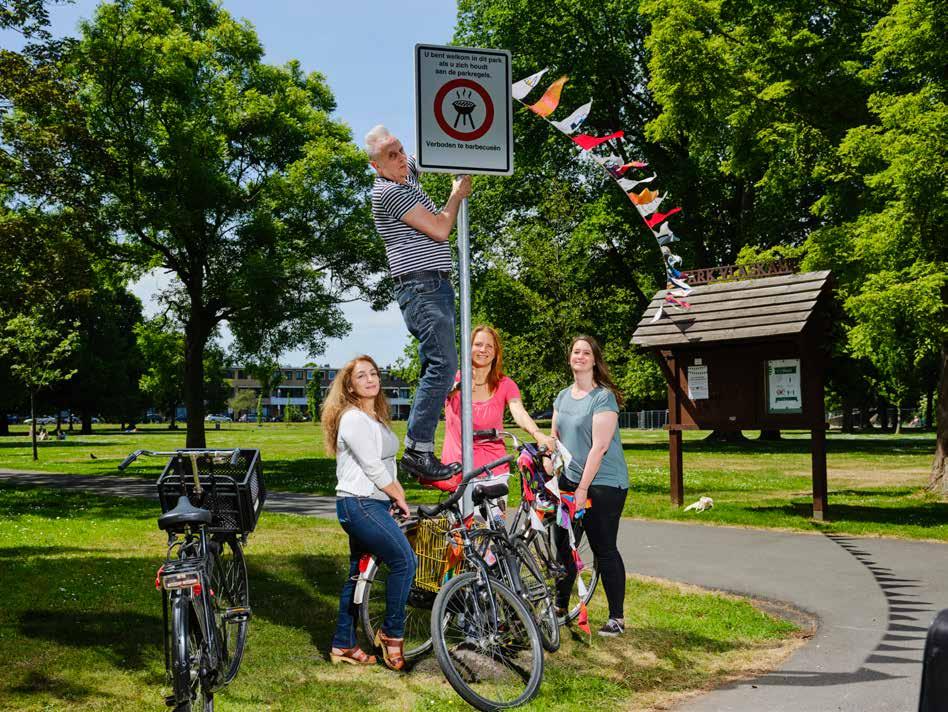 Sommigen zijn nog wat slaperig, op deze zondagmorgen. Ze kwamen net uit hun tent gekropen en gaan nu aan het ontbijt. Het was gezellig gisteravond. Kamperen midden in buurtpark De Verademing, met zicht op de majestueuze Elektriciteitsfabriek. ‘Je snurkt’, zegt de ene kampeerder tegen de ander. In het dagelijks leven waren ze waarschijnlijk langs elkaar heen gelopen. Maar na zo’n nachtje doorhalen op de buurtcamping wordt dat toch anders, weet ‘campingbaas’ Bonny. Dit is de vierde editie. De kinderen hebben de tijd van hun leven en fietsen tussen de scheerlijnen door. ‘Mama, mag ik nog een croissantje?’