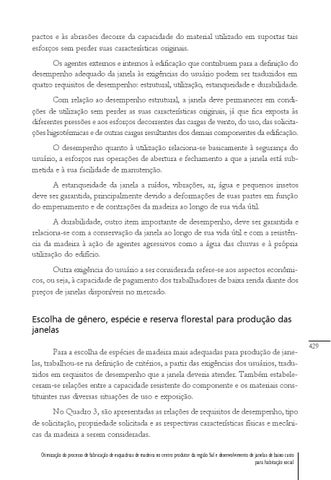 Escolha de gênero, espécie e reserva florestal para produção das janelas Para a escolha de espécies de madeira mais adequadas para produção de janelas, trabalhou-se na definição de critérios, a partir das exigências dos usuários, traduzidos em requisitos de desempenho que a janela deveria atender. Também estabeleceram-se relações entre a capacidade resistente do componente e os materiais constituintes nas diversas situações de uso e exposição. No Quadro 3, são apresentadas as relações de requisitos de desempenho, tipo de solicitação, propriedade solicitada e as respectivas características físicas e mecânicas da madeira a serem consideradas. Otimização do processo de fabricação de esquadrias de madeira no centro produtor da região Sul e desenvolvimento de janelas de baixo custo para habitação social