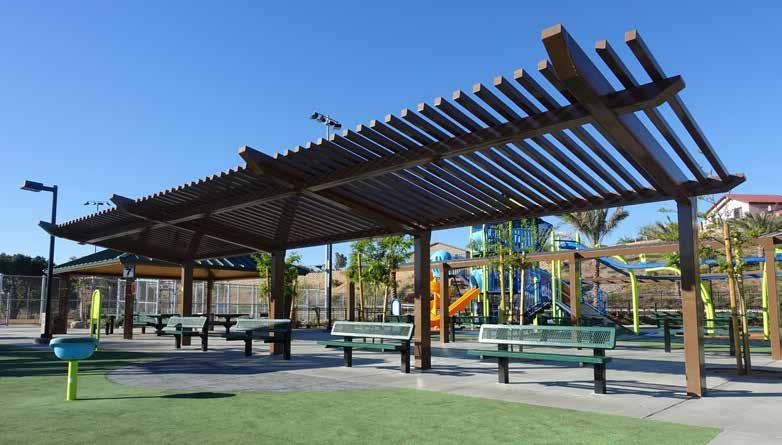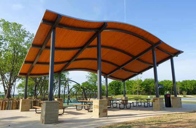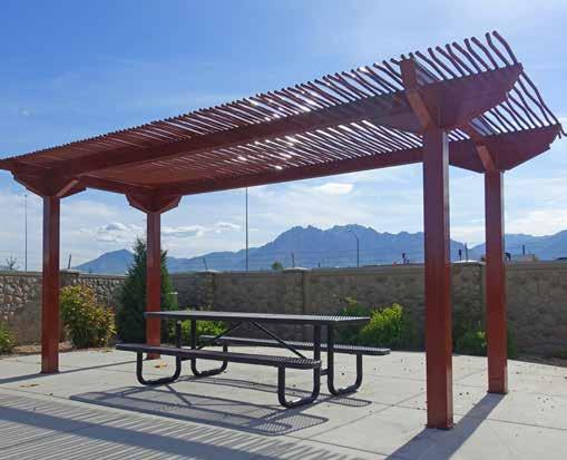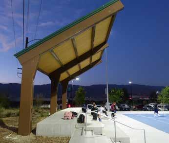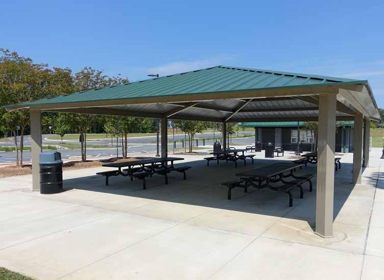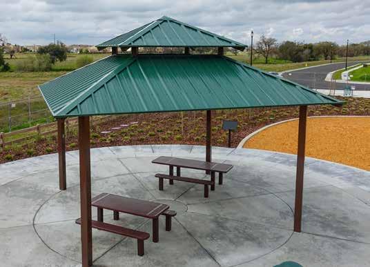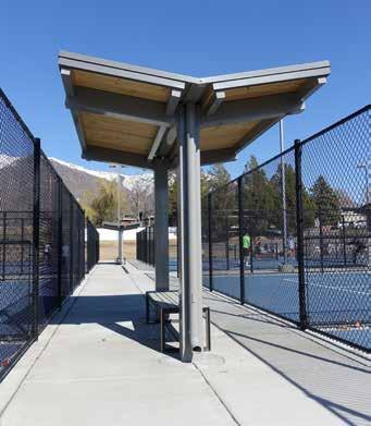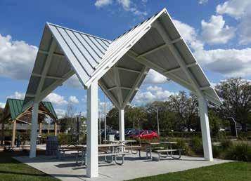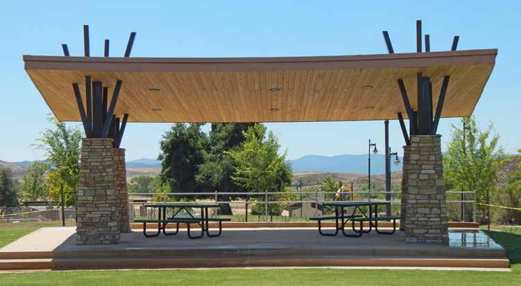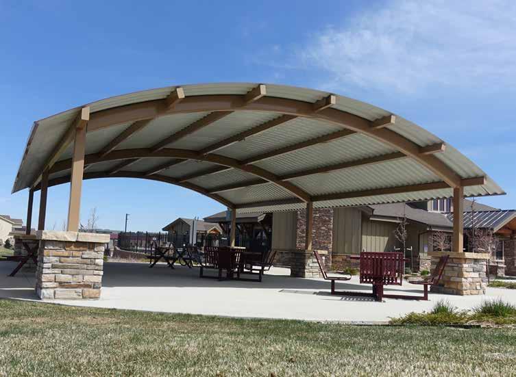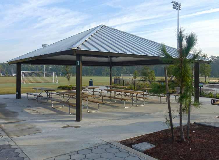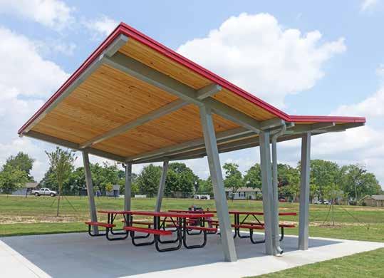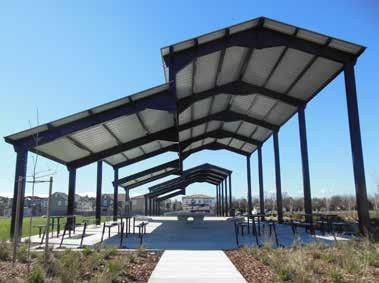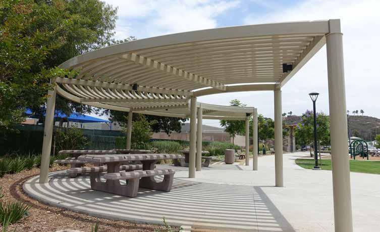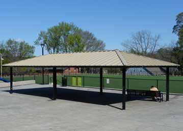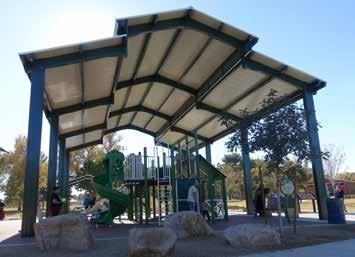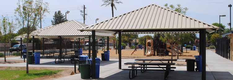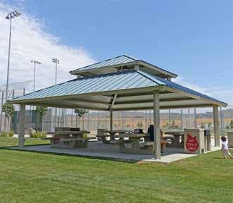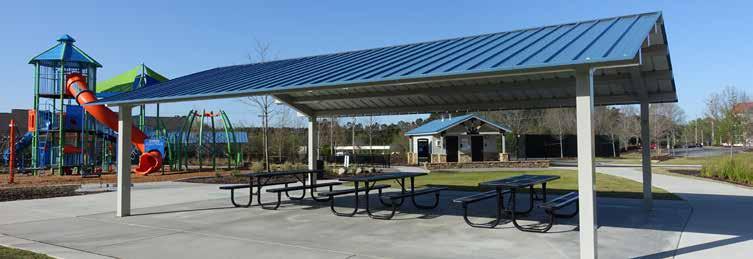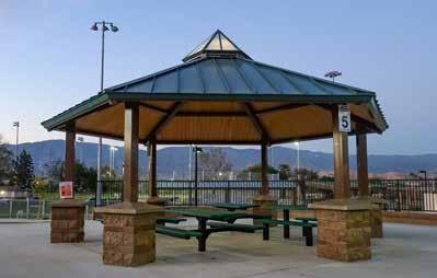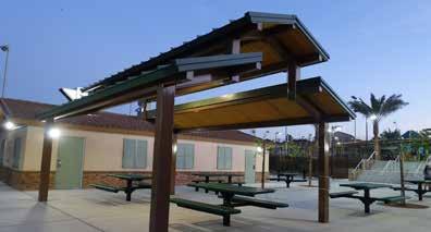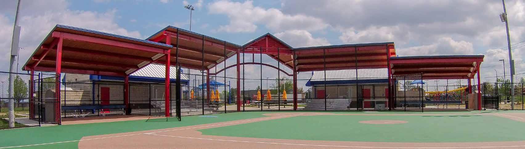 Several different structures were designed for Frisbie Park to provide appropriate shade and coverage for each area. The coordinating colors and styles make this facility both eye-catching and practical for many hours of entertainment both day and night.