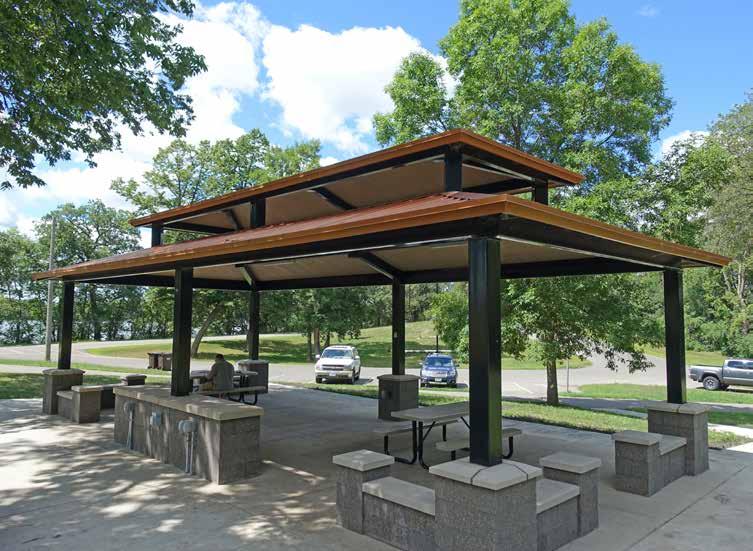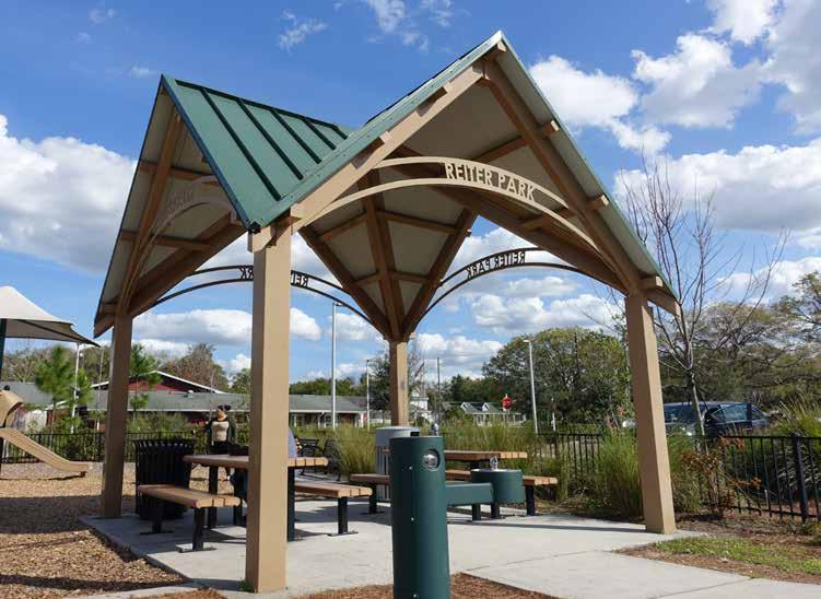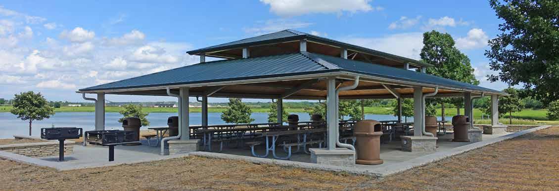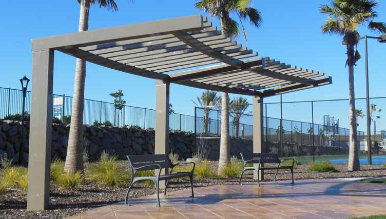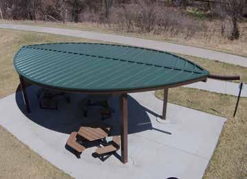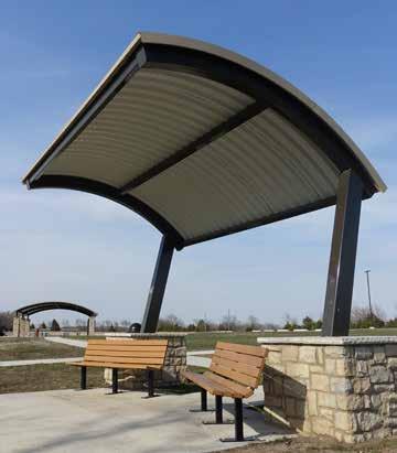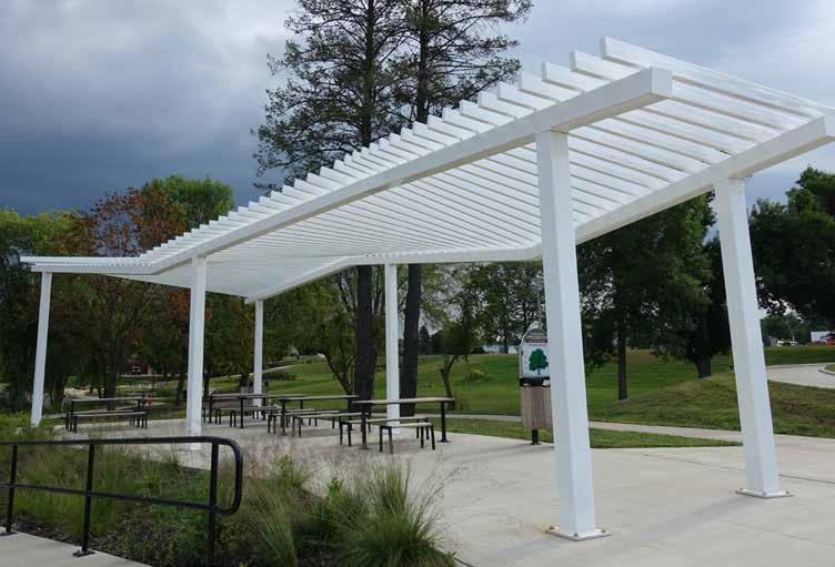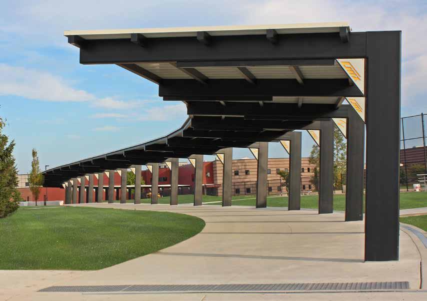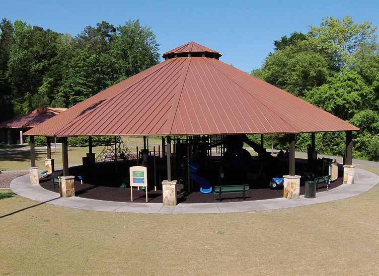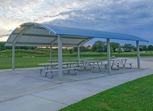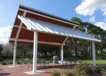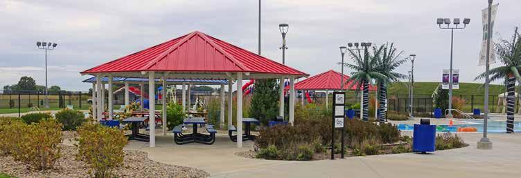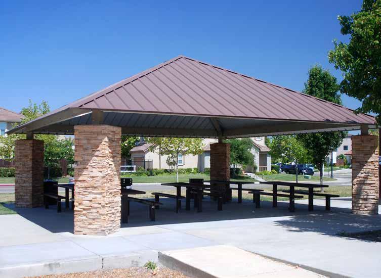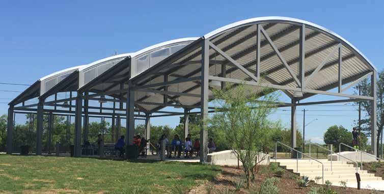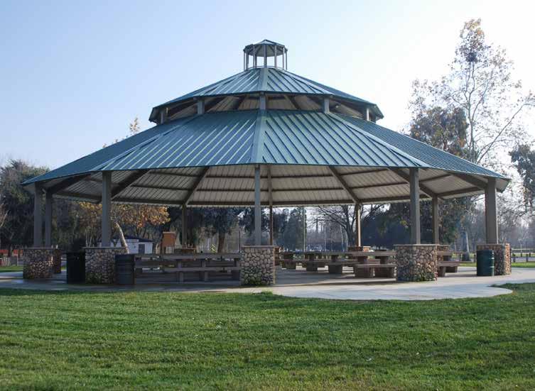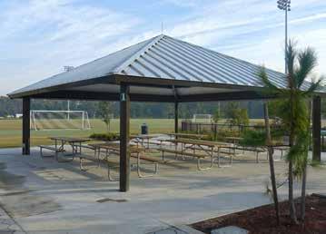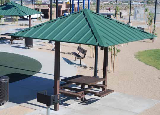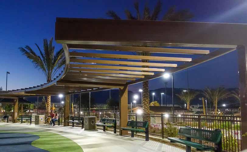 Several different structures were designed for Frisbie Park to provide appropriate shade and coverage for each area. The coordinating colors and styles make this facility both eye-catching and practical for many hours of entertainment both day and night.