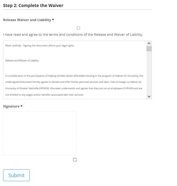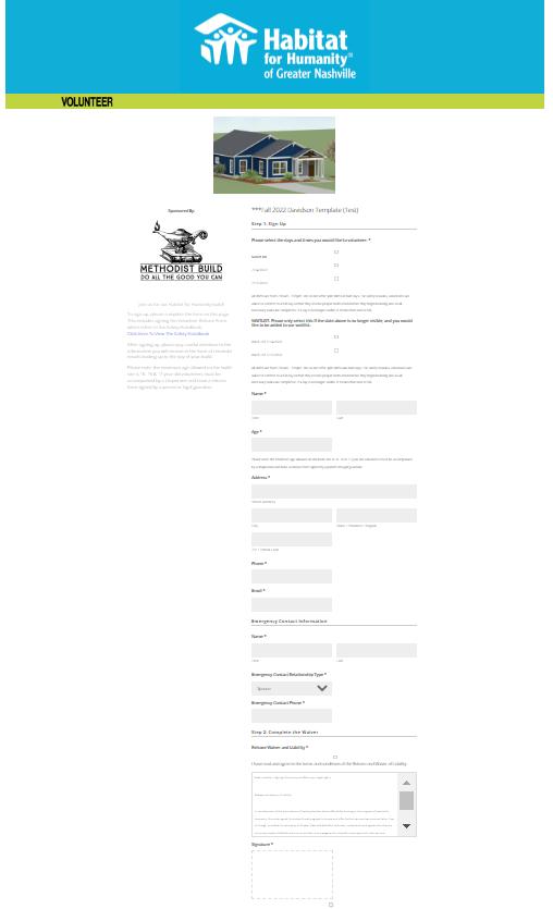 This page is where volunteers sign up for their chosen volunteer date(s) and sign the waiver.