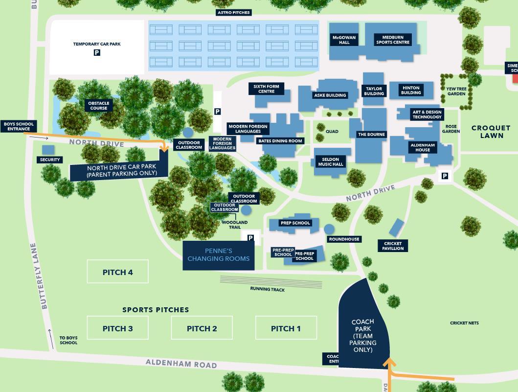 Weekend matches parents and coaches must park in the coach park. For weekday matches parents may park/drop-off students in the temporary car park or the North Drive car park. There is access via Aldenham Road to the car park.