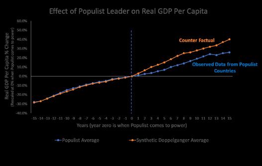 A reasonable question to ask is might economic slowdown under populists be attributed to the economic cycle, or to factors outside of their control? The point of the synthetic control is to minimise such effects. The other countries in the model are chosen such that their economic cycles are ‘in-phase’ with that of the country being modelled. Essentially, the economies of the test cell and control cells have similar economic cycles and external shocks will have the same or comparable affects on all member countries within a group.