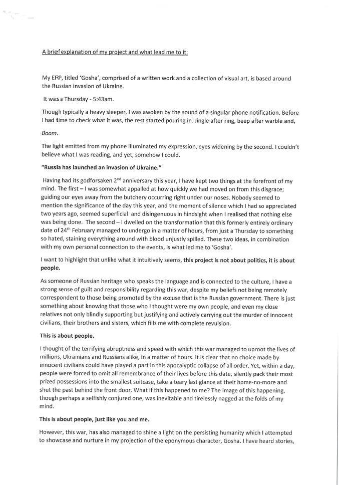 with supporting materials. All will have engaged in their own research and presented their views, positions, intentions and/or judgements in an academic manner. The project seeks to encourage them to be intellectually ambitious alongside developing the creativity, independent study skills and broader scholastic attributes which will allow them to thrive at the finest institutions of higher learning.