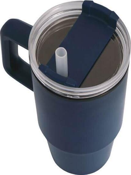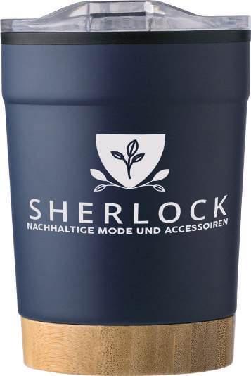 Praktisch: diese doppelwandige Edelstahl-Thermosflasche kombiniert im Körper einen großen Becher sowie einen passenden Deckel im Sockel.