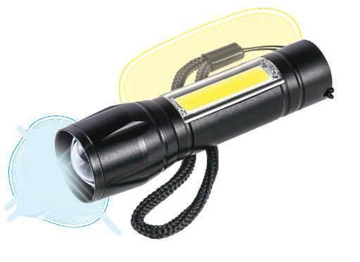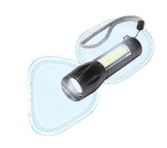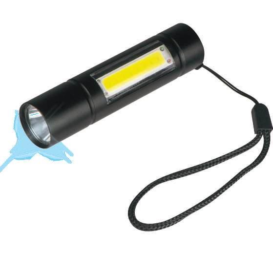 Leistungsstarke LED-Taschenlampe (250 Lumen) kombiniert mit einer seitlichen COB-Lampe (100 Lumen) in Aluminium-Gehäuse. 3 Leucht-Modi: Dauerlicht, Notlicht und Seitenlicht. Betrieb erfolgt über einen per USB-C wiederaufladbarer 400 mAh Akku. Handschlaufe und Typ-C Kabel gehören zum Lieferumfang.