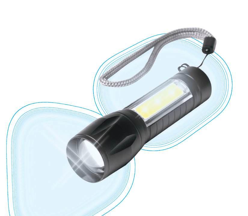 Leistungsstarke LED-Taschenlampe (250 Lumen) kombiniert mit einer seitlichen COB-Lampe (100 Lumen) in Aluminium-Gehäuse. 3 Leucht-Modi: Dauerlicht, Notlicht und Seitenlicht. Betrieb erfolgt über einen per USB-C wiederaufladbarer 400 mAh Akku. Handschlaufe und Typ-C Kabel gehören zum Lieferumfang.