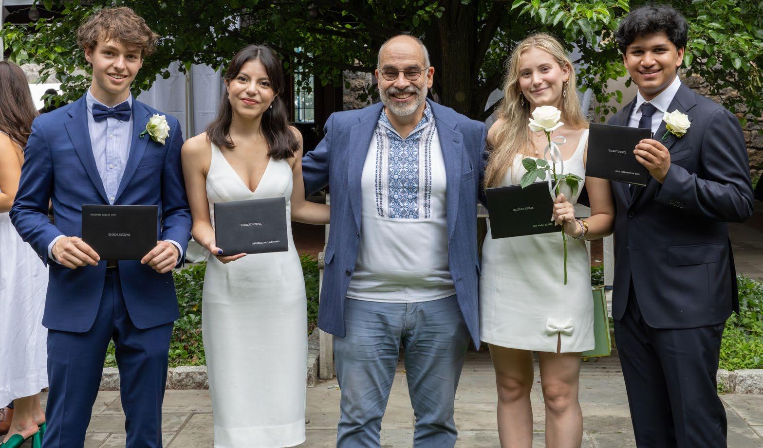 Upper School history teacher Vladimir Klimenko (center) with recent graduates (left to right) Jack Magidson, Gabrielle DiazAlcantara, Nina Zeltser and Aran Basu