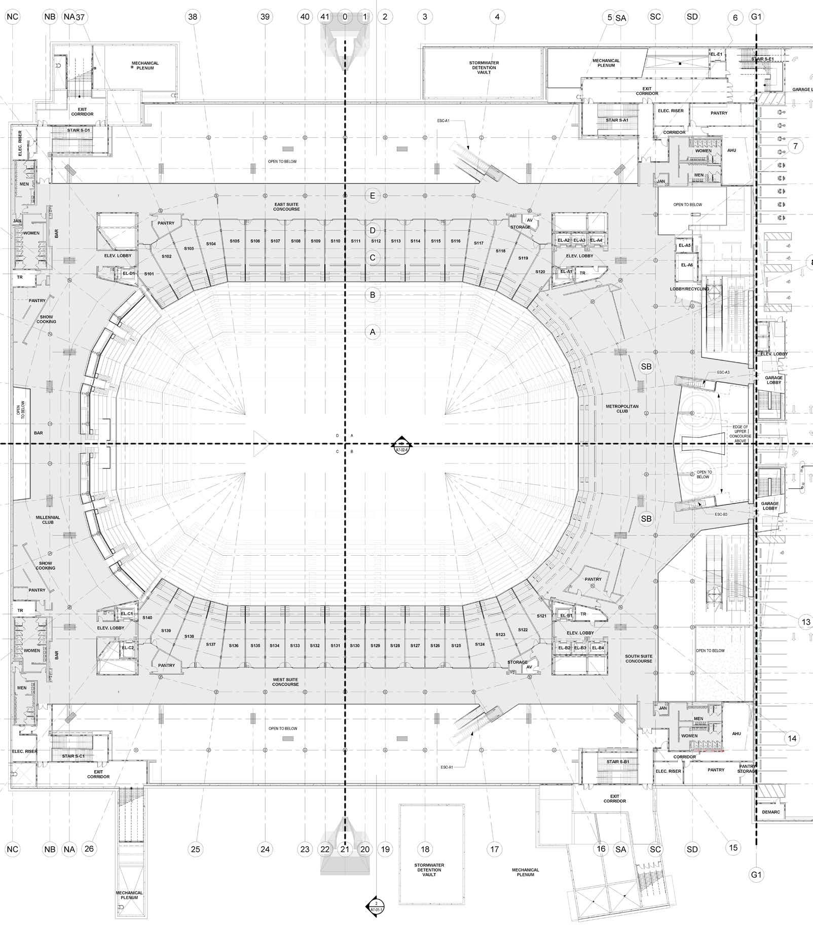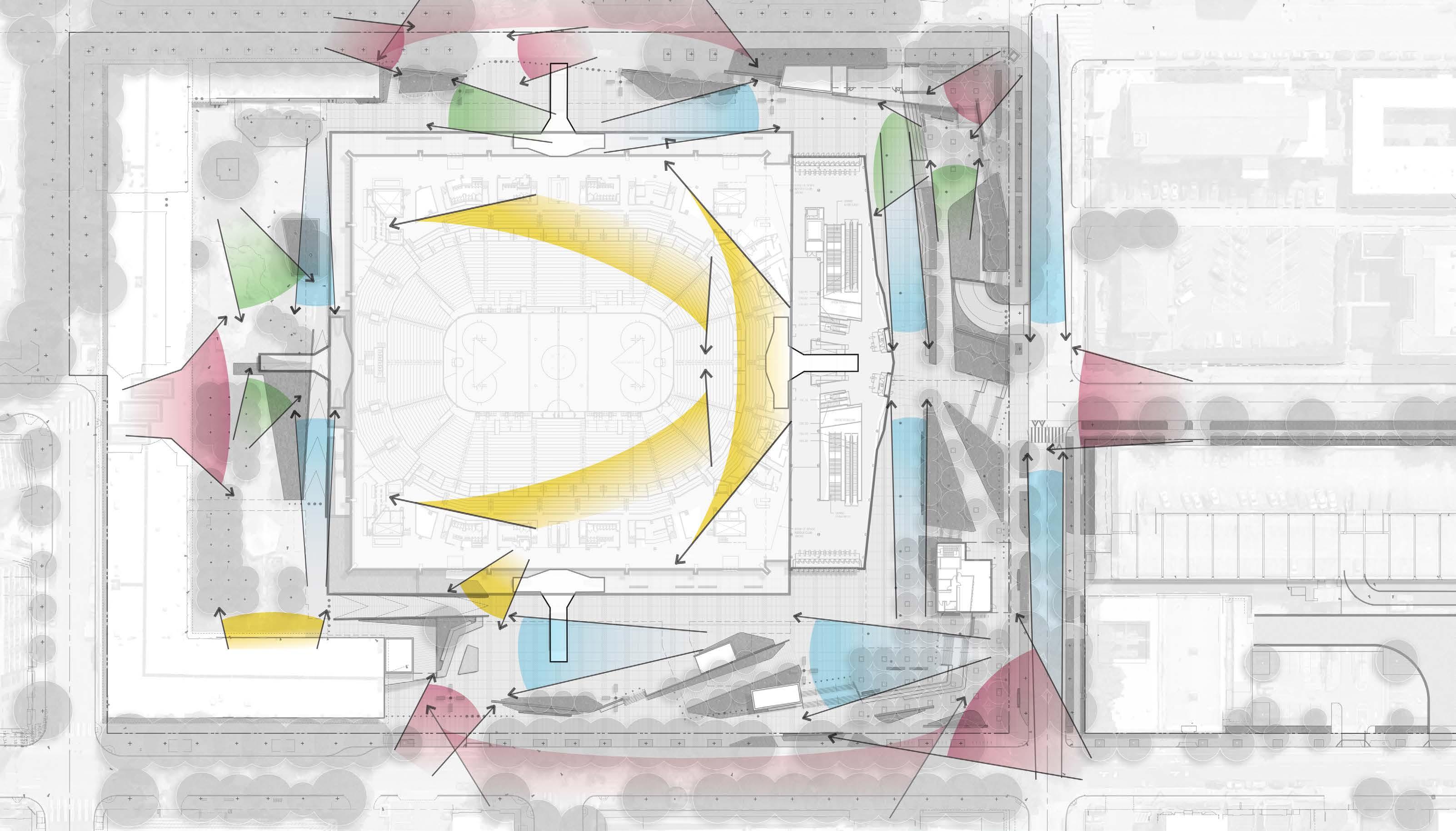 Art at the Arena will conceptually mediate between interior and exterior environments by referencing and revealing both the events and sense of collectivity that happen inside the building on its outside, and vice versa, through thematic content, real-time activation of lighting and data, and creative interactive experiences. Echoing and reverberating the energy of the interior event in the exterior spaces will extend the collective experience beyond the Arena’s interior bowl to encompass a larger setting and community.