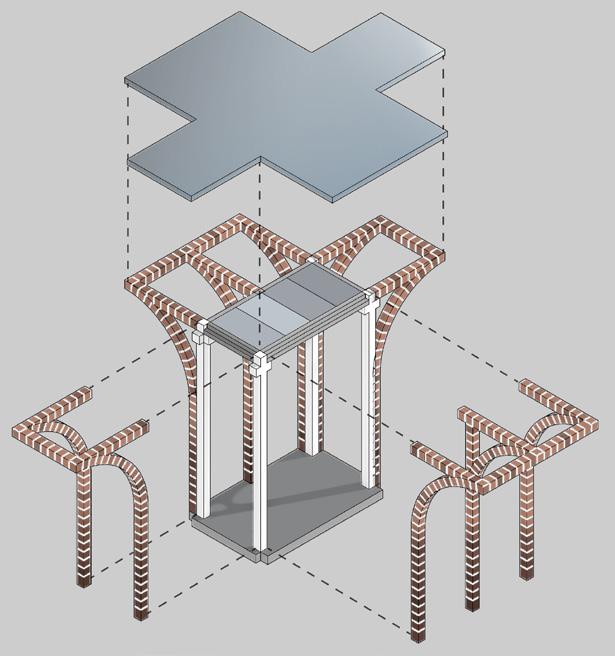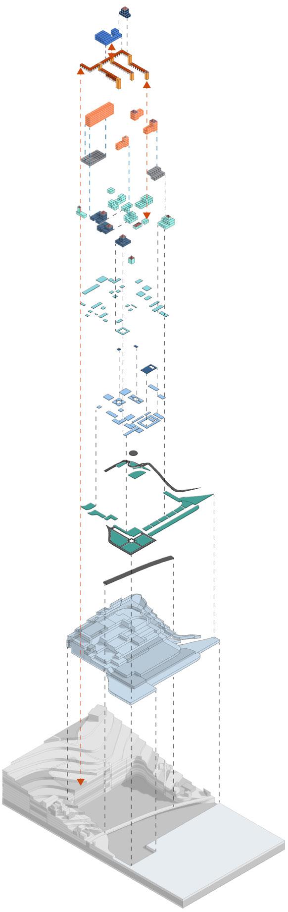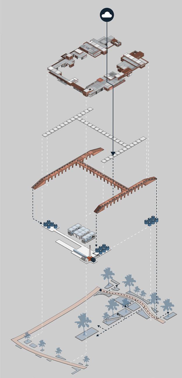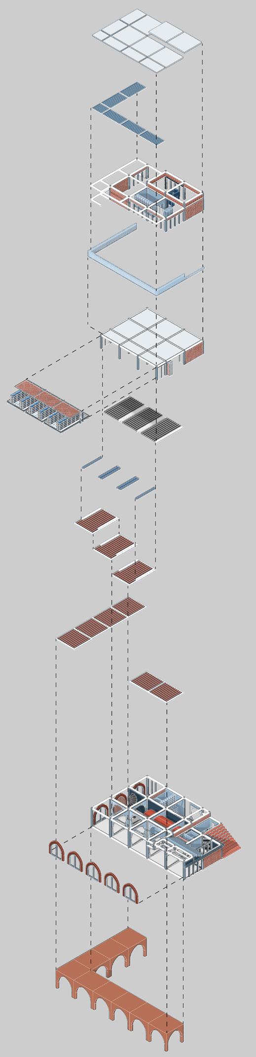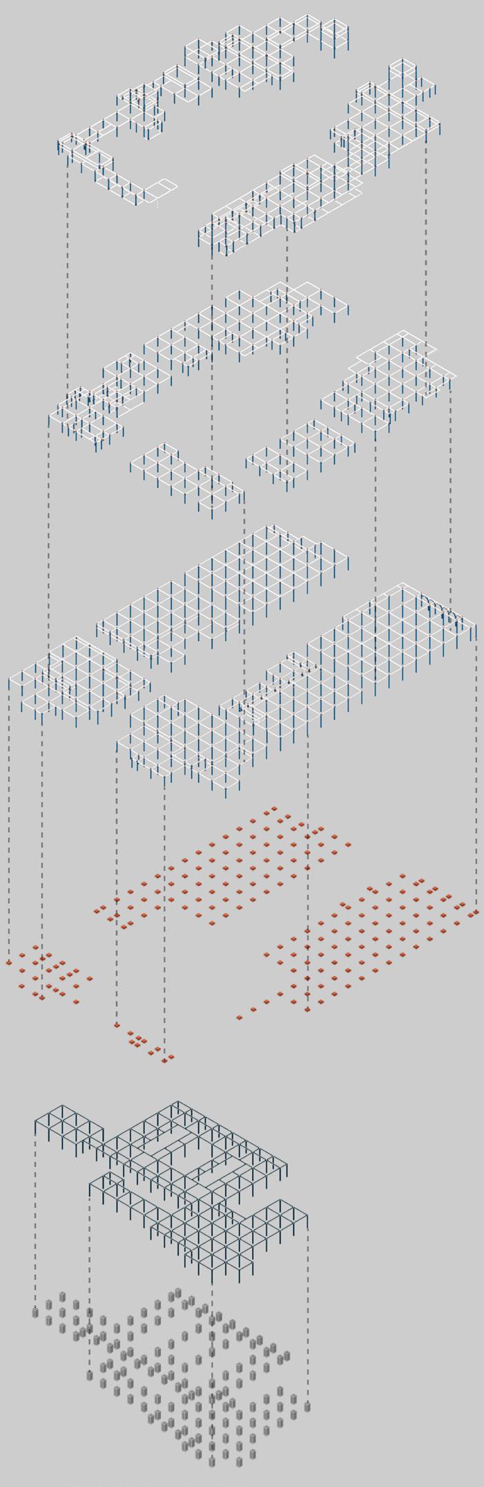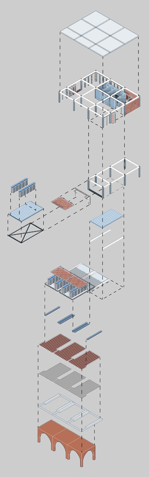 Monitoring the building process alongside the construction programme is essential. This is especially true when considering the fact that the underground biomass incinerator and building blocks manufacturing area will be accessed and used while the design is still being built. Given it is the secondary structure that is made of composite materials that incorporate waste, during the timeframe in which the primary structure is being built on the upper levels a stockpile of shading panels and outer bricks can be made. Ensuring an architect visits the site weekly should be sufficient to ensure construction is kept on time. Given the structural system being used it is both simple and takes direct influence from existing practices; the development of the building should be straightforward.