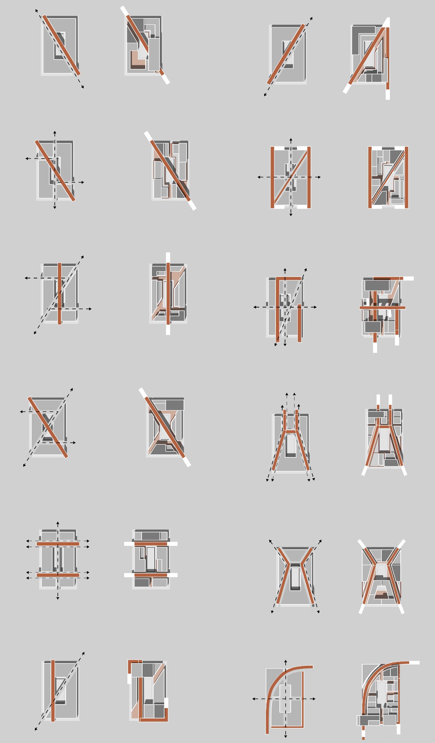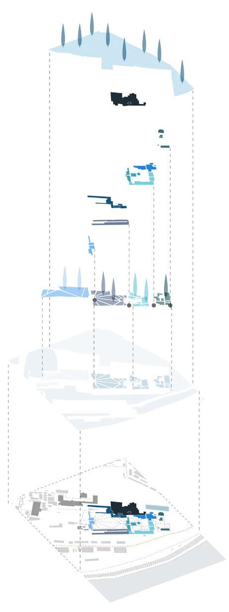 ‘A’ represents the basic layout of Topkapi palace. The garden essentially becomes the primary means of defining the sites layout. Options ‘B’ and ‘C’ begin to redefine this, while still using the base components found in the initial scheme. Yet options ‘D’-’G’ represent a more radical means of reimagining this systems programmatic layout. A much more in-depth study of the relationship between these individual components and their adjacent garden will be essential in defining this project.