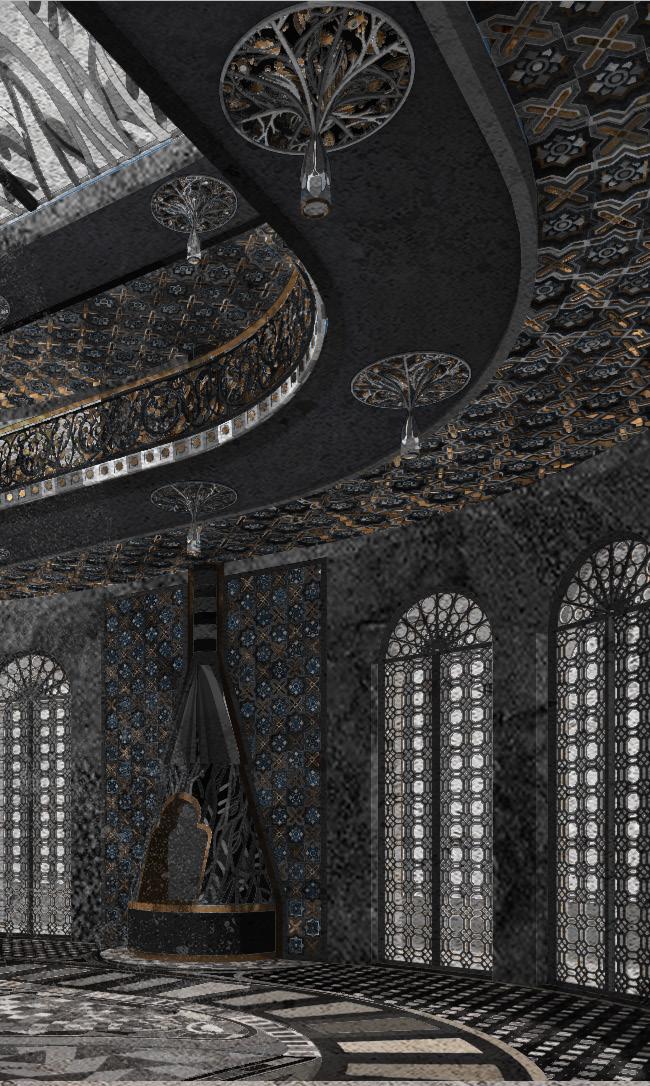 In order to investigate the points described I looked into the past and current role of Topkapi palace, alongside various other historical buildings. By trying to decontextualize such an intervention I attempted to create a modern day interpretation of such a space. Orientalism, and its fever dream-like qualities were analysed when developing a distorted image of the Topkapi. In addition to this, looking into how ornament relates to both the structural and aesthetic qualities of a building was central in developing a revitalized native style.