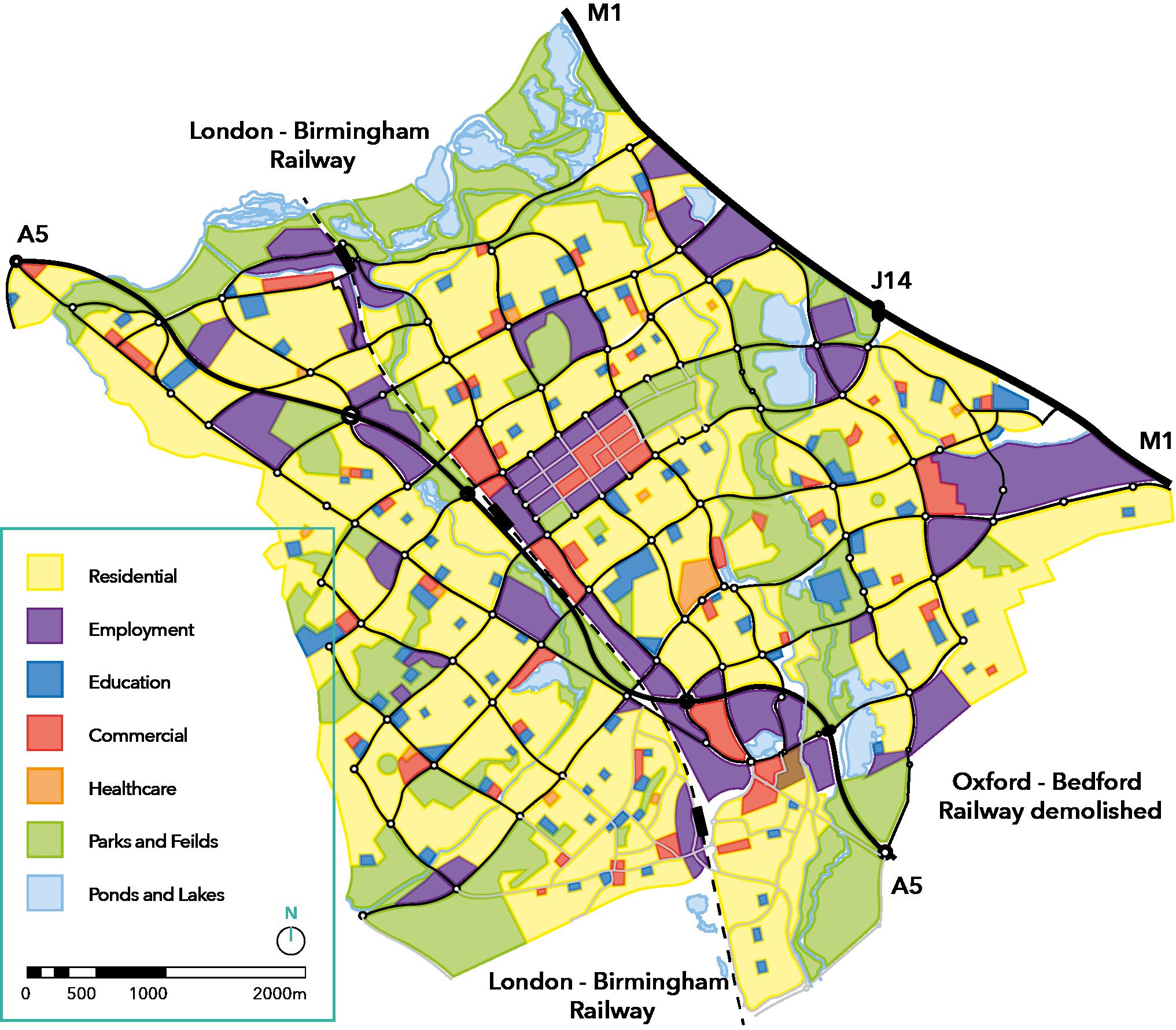The positioning of facilities is a significant feature of MK’s urban design that differs from the ‘traditional city model’, where most of the activities such as business and shopping, takes place in the centre. The MKDC intended for the city to be fairly distributed in terms of the location of facilities, as highlighted in figure 13. Residential, employment, education, commercial, nature, and heritage zones are all scattered around the city “for an even distribution of traffic” (The Milton Keynes planning manual, 1992), where residents travel towards the outskirts of the city rather than the centre, hence, reducing congestion.