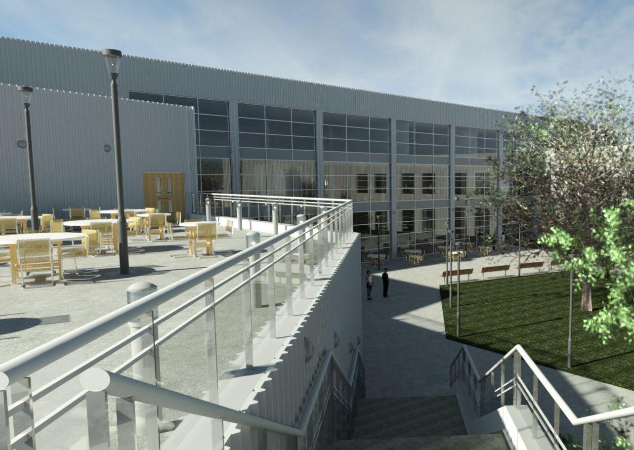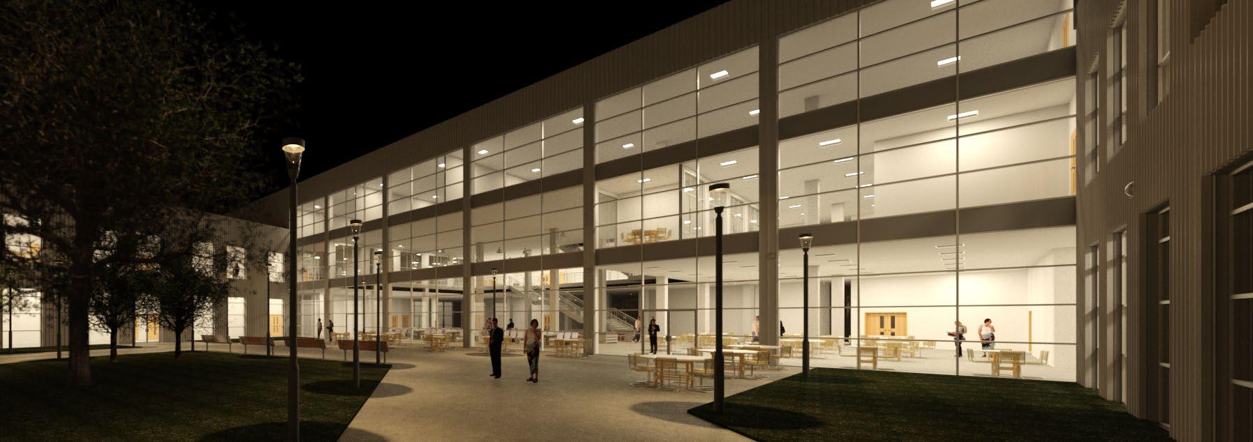 Interior Atrium Visual: An interior shot of an atrium, a space where the public can hangout and connect with one another. The space includes a large full glass facade and skylight to create an open and airy atmosphere. These images were created using SketchUp and enhanced with Photoshop