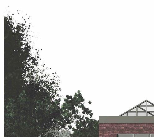 This drawing was made using Illustrator and Photoshop, and highlights how the building interacts with its immediate surrounding whilst tackling with impact loads from fast passing trains with a shear wall and plant room buffer to minimize noise. Additionally, the tree plantings on the east are strategically placed along with the 4.95m corridor/breakout space to stop direct sunlight entering the sports hall whilst allowing windows on the facade for viewing/connecting purposes.