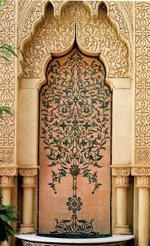 Color and texture drive the design, which uses a neutral palette and pops of green to represent Islam.