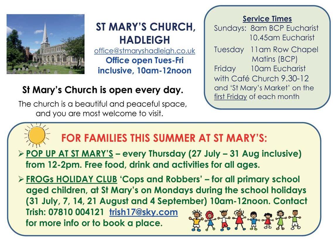 For more details and to register your interest contact, in the first instance, Claire at office@stmaryshadleigh.co.uk