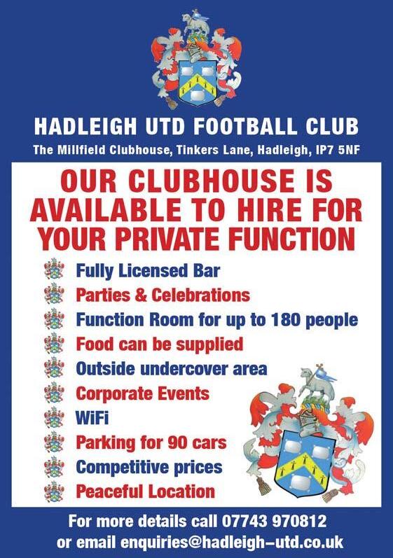 Additionally, I’d like to invite the wider community to come and see the amazing facilities we are so fortunate to have. A cozy, clean and welcoming Clubhouse with kitchen and catering facilities and licensed bar. We have lots of plans for events to put on over the coming months, so please look out for our news in the Hadleigh Community News. We’d love to share our fortunate circumstances with everyone, so if you have an upcoming birthday, anniversary, wedding - do please come and see us, we’d love to help!