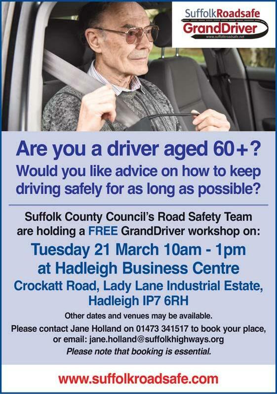 GrandDriver, run by the Suffolk County Council Road Safety Team, is a scheme for anyone over the age of 60 who currently drives and would like to keep driving for as long as possible. There are two parts to the scheme - a theory workshop, and a driving assessment. The workshop lasts for 3 hours and we discuss how driving has changed, and how to cope with this as we get older, how our health can affect driving, and simple adaptions you can make to ensure your comfort in the car. There is a chance to discuss any concerns you may have about driving; we also have a refresh on the Highway Code and do some hazard perception.