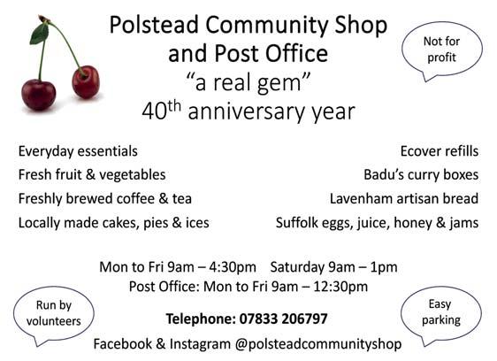 6 Telephone Community News on 01473 823366 From budget doors to high end composite door products, there will be a door to suit any requirement. Free No Obligation Quotes. All products installed between 6-8 weeks from ordering. OTHER SERVICES INCLUDE: Upvc windows and doors • Misty glass replacements • Coloured windows Aluminium products • French, Patio and Bi-fold doors Facia, Soffit, and guttering • Conservatories • All types of repairs GUARANTEED TO BEAT ANY OTHER QUOTE! CHECK OUT OUR WEBSITE FOR MORE INFORMATION. Tel: 07872 903135 or 01473 822209 Email: luke@thorrdoors.co.uk www.thorrdoors.co.uk Any Door • Any Size Any Colour • Any Time THORR DOORS OVER 20 YEARS EXPERIENCE POLSTEAD FILMS THE LESSON Friday 8th March at Polstead Village Hall - Doors open 7 pm Starring Richard E. Grant, Julie Delpy, and Daryl McCormack “This literary thriller is a masterclass in tension. Richard E. Grant is superb as a supercilious and sly British author in this country house drama” to reserve or buy in Polstead Community Shop All proceeds in aid of Polstead Village Hall Charity No. 304933 abandoned, some made homeless through their Suffolk & Essex Small Animal Welfare, Registered Charity No.1124029, Stoke Road, Leavenheath, CO6 4PP. Tel: 01787 210888 www.sesaw.co.uk Ken’s SESAW News Suffolk & Essex Small Animal Welfare Reg charity no 1124029 Cavendish Bowls Club from Annette on 01787 282817 or Jacqui on 07555 518299.