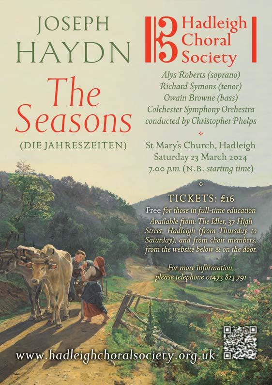 Telephone Community News on 01473 823366 EVERYDAY DINING - NOT JUST FOR A CELEBRATION! Lunches – Monday to Saturday Two course lunch, glass of wine and coffee @ £35.50 per person Three course lunch, glass of wine and coffee @ £42.50 per person Sunday Lunch Two course Lunch @ £32.50 per person Three course Lunch @ £39.50 per person Tea and coffee @ £3.75 per person A La Carte Menu Available each evening Afternoon Teas A Traditional Afternoon Tea served with a selection of assorted sandwiches, homemade sausage roll, cakes and scones with clotted cream & preserve £32.00 per person www.hintleshamhall.com Hintlesham, Ipswich, Suffolk IP8 3NS Reservations Tel: +44(0)1473 652334 Email: reservations@hintleshamhall.com Opening Hours: Sunday Closed Monday, Wednesday & Friday 9 am to 5.30 pm Tuesday 9 am to 7.00 pm Thursday 9 am to 8.00 pm Saturday 8.30 am to 4.00 pm Tel 01473 822191 W WAATTTTIISSHHAAM M S T A T I O N H E R I T A G E 1st SUNDAY OF THE MONTH APRIL TO OCTOBER www.wattishamstationheritage.org OPEN TOBOOKVISIT 1stSundayoftheMonth ApriltoOctober Tobookvisitwebsite: www.wattishamstationheritage.org OPEN Art Matters At The Health Centre contact Jan Devey, Chair of the PPG , 01473 827091 or 07881 798999 or deveys@btinternet.com and not the Receptionists. 10% of the purchase price will go to the Hadleigh and Boxford Medical Practice Charitable Trust. Sunday 17 March 4pm at Stratford St Mary Church CO7 6LS SOLEM QUARTET AND SHIRY RASHKOVSKY, VIOLA Janáček, String Quartet no 1, Kreutzer Errollyn Wallen, String Quintet (new commission) Felix Mendelssohn: String Quintet no 1 in A op 18 Tickets are £18 children under 18 free with paying adults. Book online at www.svam.org.uk or direct from svamtickets@btinternet.co.uk Tel: 01206 298426. Or buy from Grier and Partners Estate gents in East Bergholt. Early Birds Wanted For further details of these luxury swimming sessions contact Jan Devey:01473 827 091 or deveys@btinternet.com To view the pool visit www.lettsswim.com