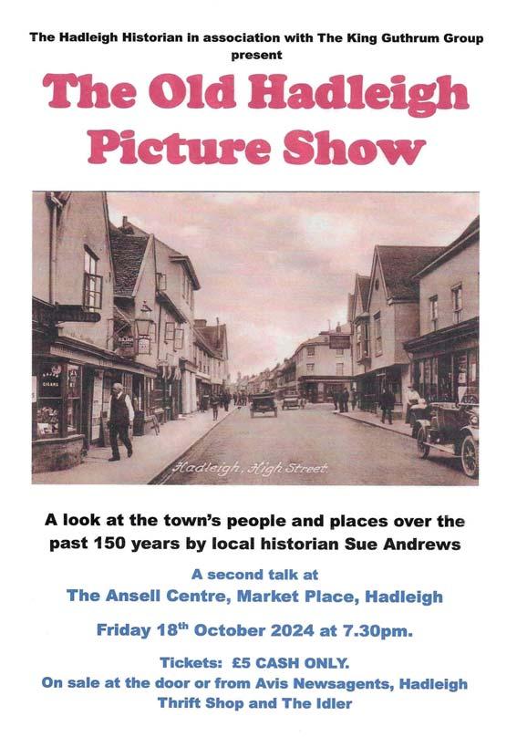 Have you heard of John Stonehouse MP or John Darwin, both of whom had their stories dramatized on television a couple of years ago? Darwin’s with the title The Thief, His Wife and the Canoe. It was not until the history of a house in Angel Street was being researched that Philip St John Ross Wilson was encountered, who had similar events in his life, which are now told in ‘The man who died twice’. As a follow on, Issue 85 will have a piece on another Hadleigh citizen entitled ‘The man who was buried twice’. The Hadleigh Historian in association with The King Guthrum Group is pleased to present ‘The ld Hadleigh Picture Show’, an illustrated series of talks by Sue Andrews, two in the autumn and two early in 2025, to be held at the Ansell Centre at 7.30 pm. These will take you on a pictorial journey through the history of the town, looking at people and places at di erent times over the past 150 years. The second show entitled From Benton End to town centre is on Friday 18 ctober.