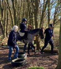 allowing lots of our riders to have a hack out in the countryside – always popular with riders, helpers and the ponies. As well as the added stimulation for the riders from listening to the bird song and looking at emerging spring to move more freely. The term ended with many Easter-themed games such as looking for chocolate eggs, egg and spoon ‘races’, etc which is a fun way for riders to engage in a range of activities whilst on horseback, helping balance, movement and decision making – all important part of therapy. The photo shows Emelia enjoying her ride on Cookie and collecting Easter eggs in the arena behind the stable yard. She started