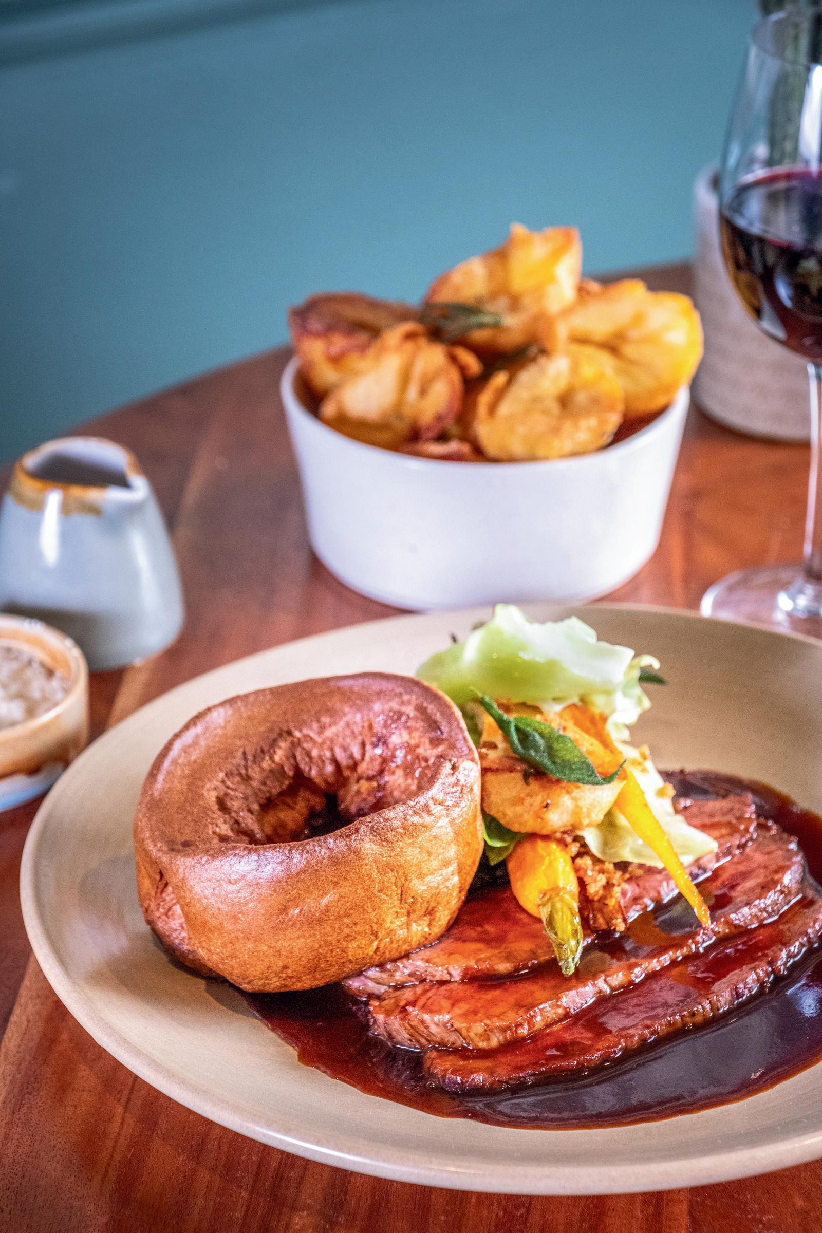 Join us for Sunday lunch and enjoy a traditional roast dinner, served with crispy roast potatoes, buttery vegetables, and a fluffy Yorkshire pudding.