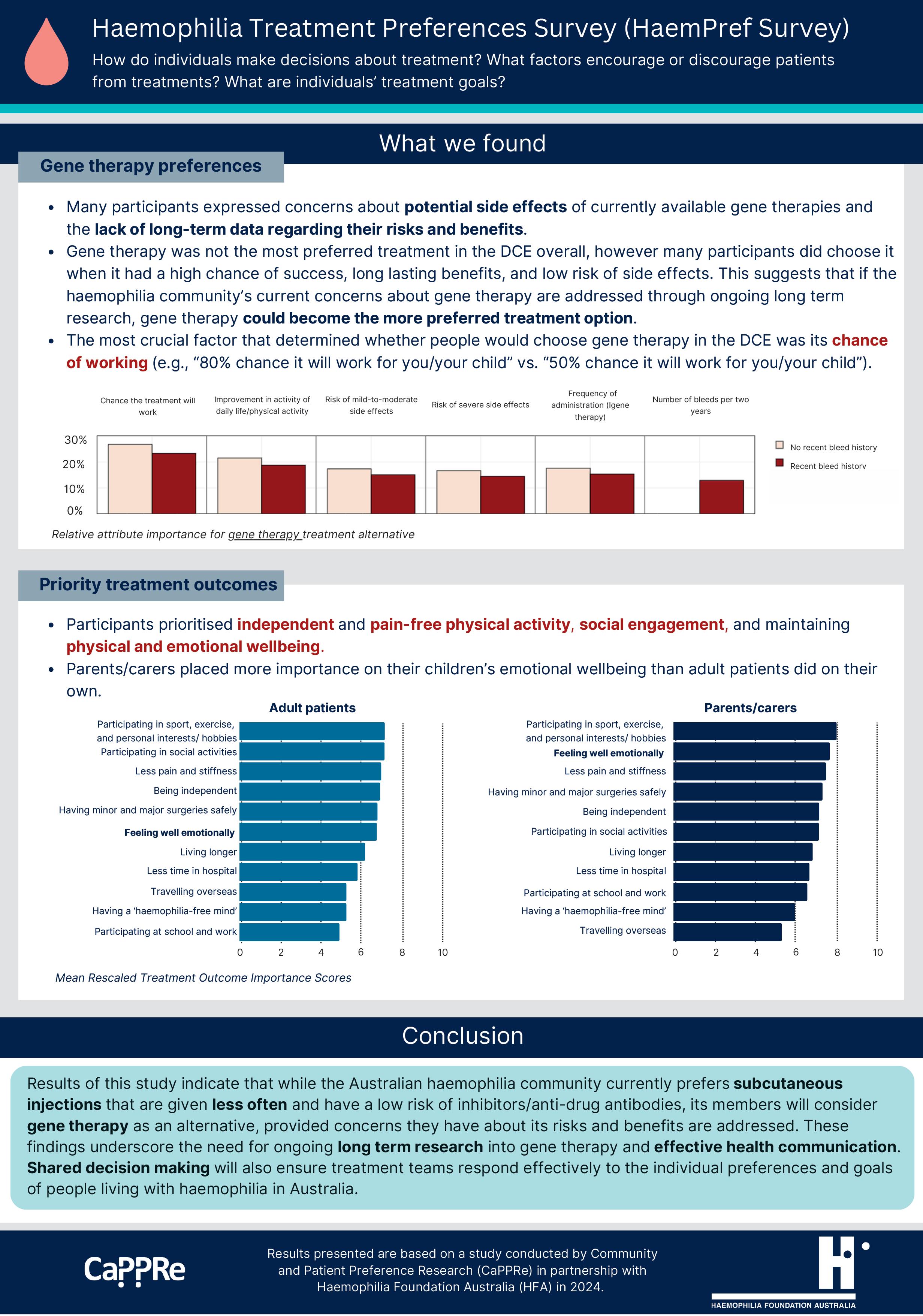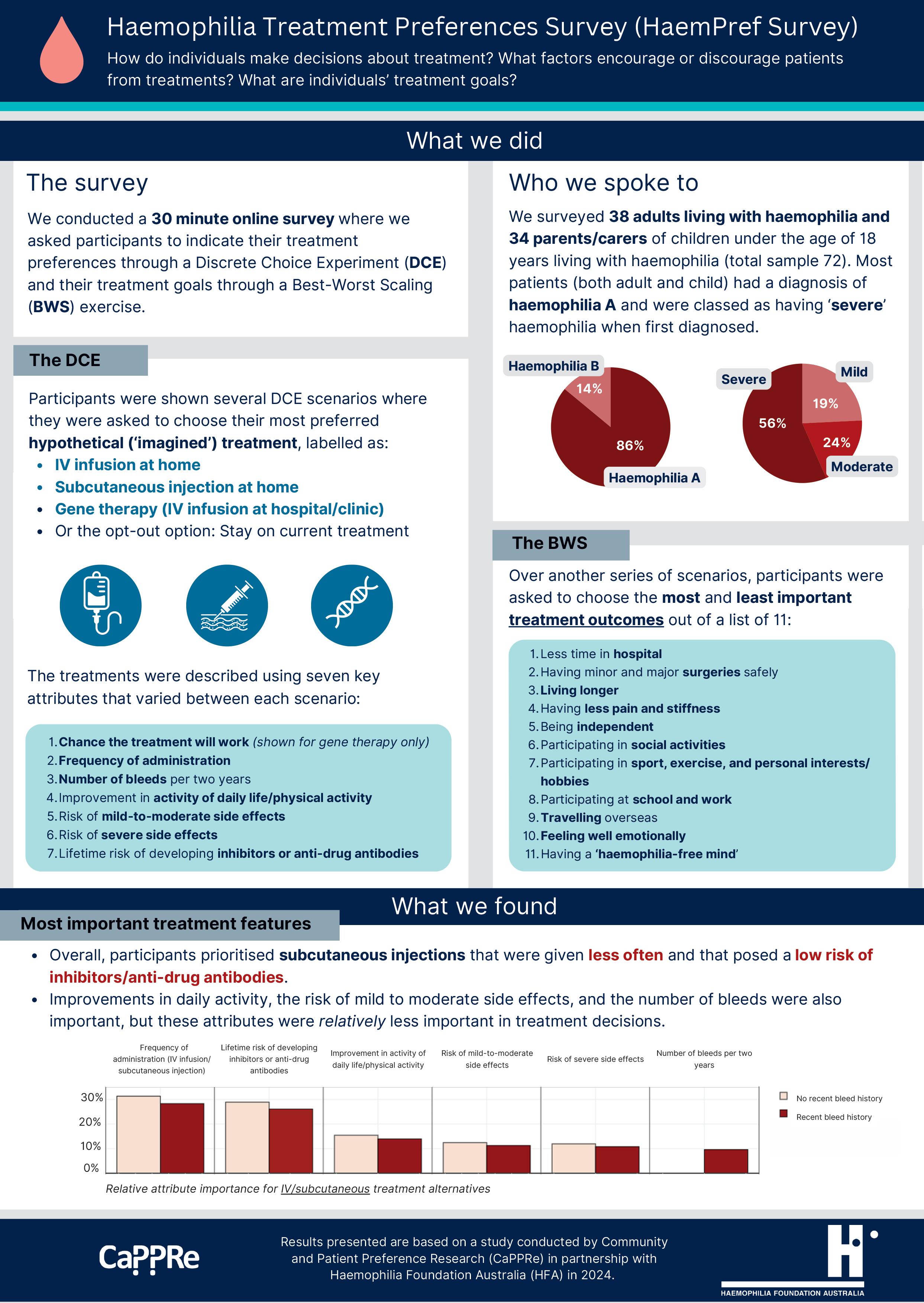 We thank everyone who participated in the 2024 HFA HaemPref (haemophilia treatment preferences) survey, that was funded independently through the Haemophilia Foundation Research Fund. The results are in: ‘while the Australian haemophilia community currently prefers subcutaneous injections that are given less often and have a low risk of inhibitors/ anti-drug antibodies, its members will consider gene therapy as an alternative, provided concerns they have about its risks and benefits are addressed’. You can read a plain language summary of the results in the pages following this article.