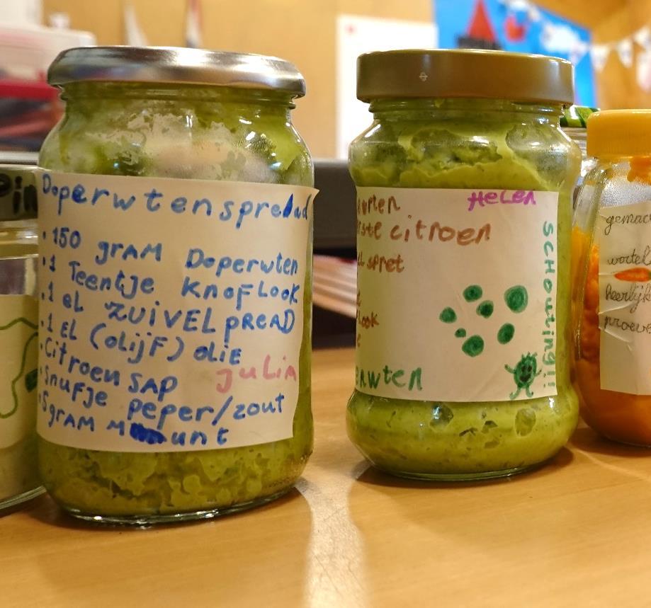De volgende morgen waren de welpen al vroeg wakker, vol nieuwe (groene?) energie. Na het ontbijt gingen we in het Sijtwendepark op zoek naar recepten voor vegetarische groentespread. Minder vaak vlees eten is iets wat je zou kunnen doen om jouw impact op de aarde aanzienlijk te verkleinen, dus dat wilden wij wel eens uitproberen. Toen alle recepten compleet waren, gingen wij de groentespreads maken. Die stopten wij vervolgens in gerecyclede potjes en plakten tot slot onze zelfgemaakte labels erop. Nieuwsgierig? Ons favoriete recept lees je op de volgende pagina!