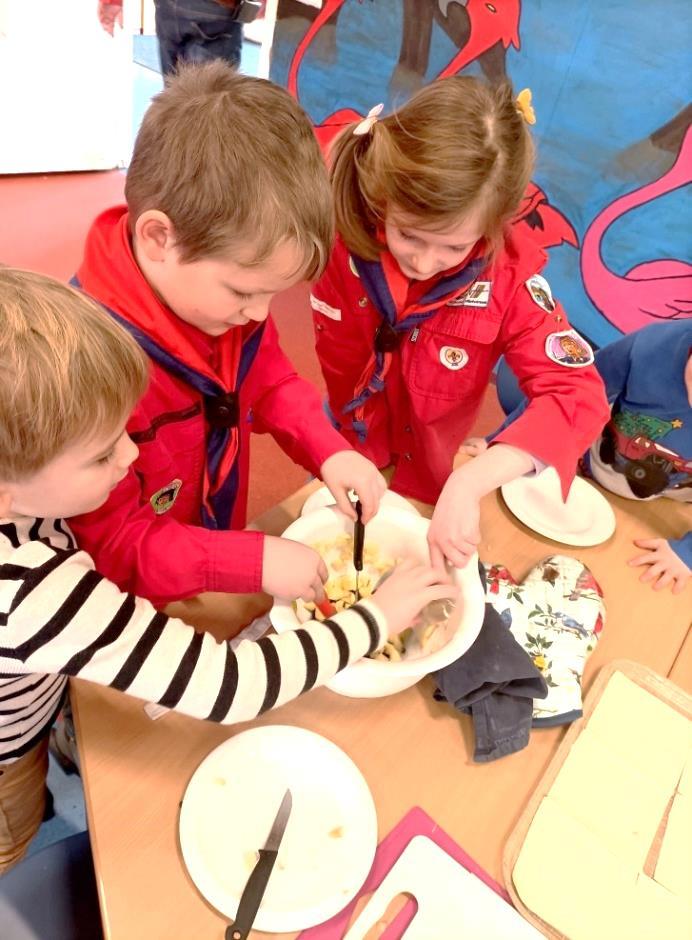 Op 20 januari zetten de bevers hun koksmuts op om iets lekkers te maken. Dat betekent natuurlijk eerst goed de handen wassen. Op het menu stond een heuse appelflap. Dus mochten de bevers aan de slag met een appel. Eerst schillen en vervolgens in kleine stukjes snijden. Daarna alle stukjes appel samen met de krenten mengen en de geheime ingrediënten toevoegen: kaneel en suiker. Dat vervolgens ook weer goed mengen en dan bladerdeeg vullen met het mengsel.