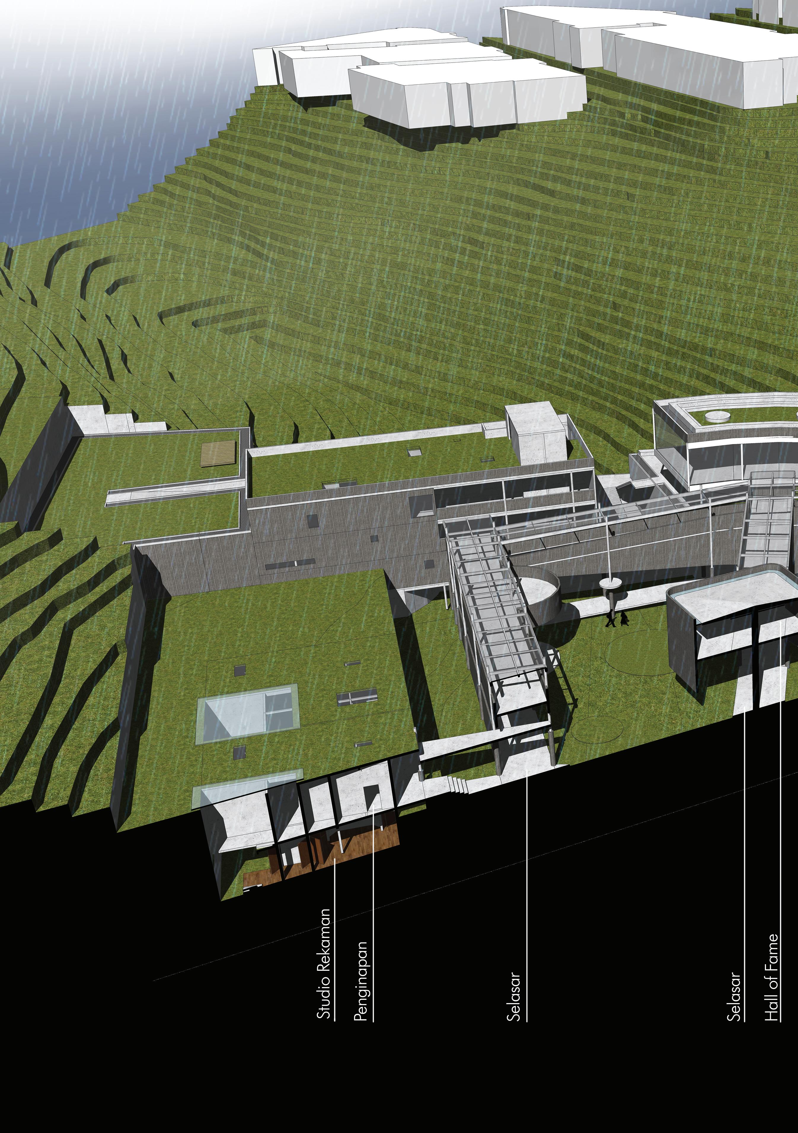 Pop music reinterpretation is a reinterpretation of pop music and is presented in an architectural form. The essence of pop music is taken “easy listening” and is used as a parameter form that is easy to understand by the public so that this building can become an icon of the pop music community in Bandung as well.