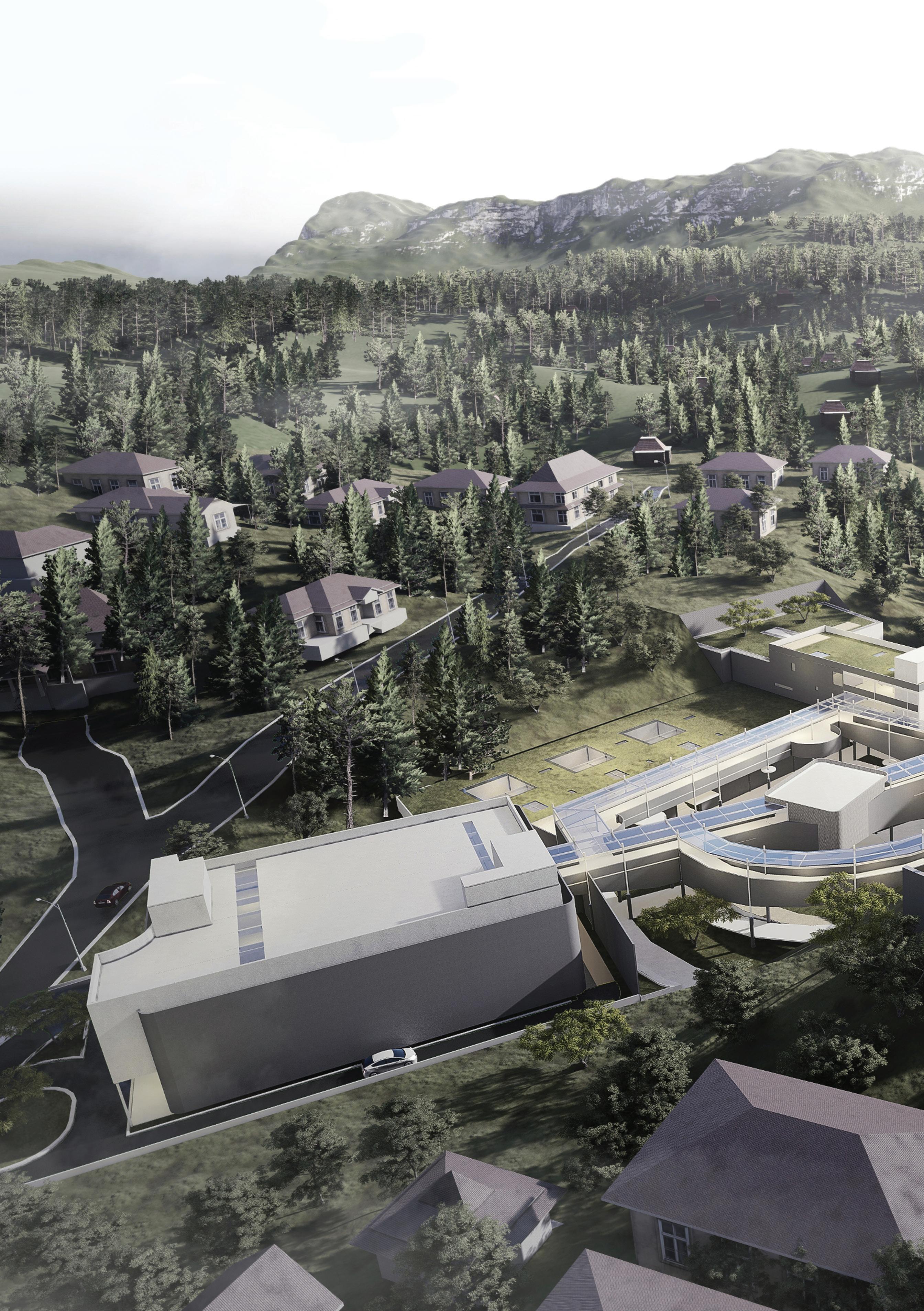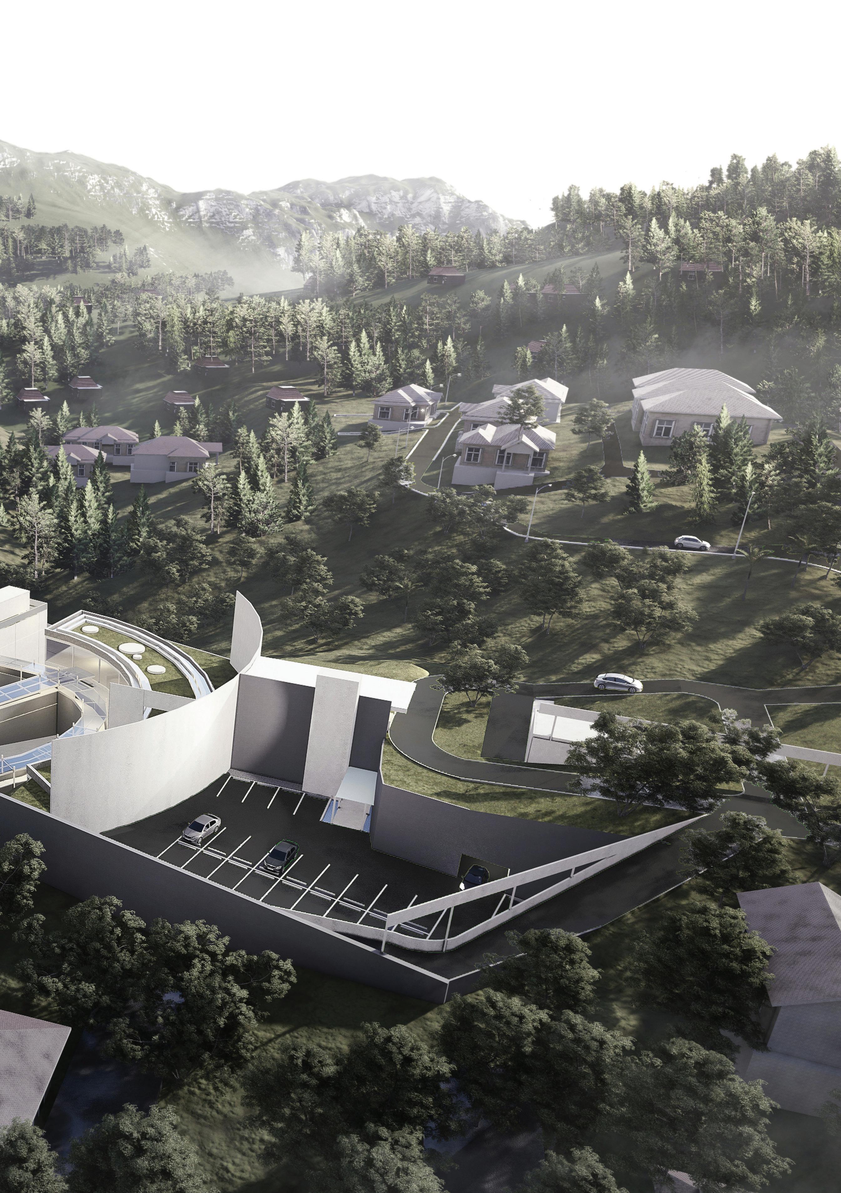 With that big amount of space requirements, the problem that will arise is a compact space organization and probably will prevent the natural ventilation and natural light. To overcome that problems, a design idea to create a V-shaped plan appear and divide the house’s mass into 2 masses that are the main mass and the service mass.