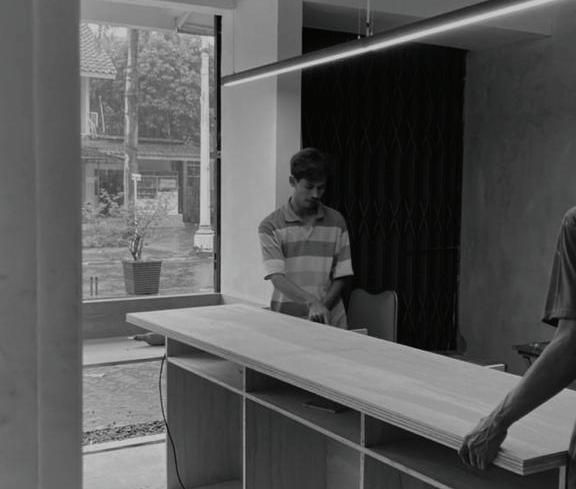 The main material that is being used for this Kopi Shiro project is local plywood and concrete exposed, as well as water-based finished and paint finished for the finishing. In some parts we did not use any material finishing to save the budget. However, we made sure that those parts still giving the function, aesthetic and does not show any ‘low budget’ impressions.