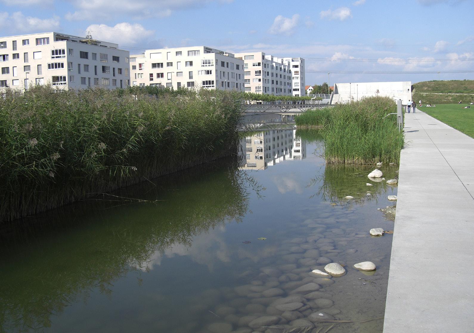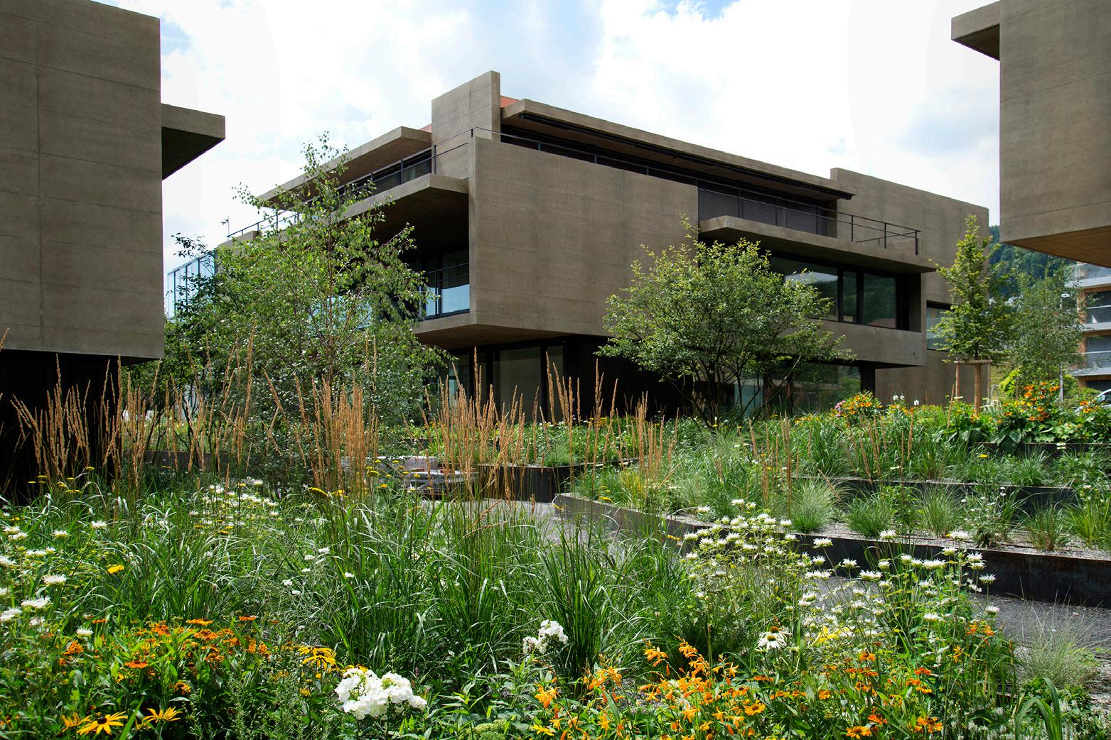 Auf dem Areal der ehemaligen Papierfabrik entstanden hochwertige Wohnungen direkt am See. Grossflächige, gartenhafte Stauden- und Gräserpflanzungen nehmen den Bezug zum See auf, bieten Privatheit und lassen trotzdem die Seesicht frei. Auf dem Areal der ehemaligen Papierfabrik entstand eine hochwertige Wohnüberbauung mit Ein- und Mehrfamilienhäusern. In der Analyse wurden die Sichtbeziehungen zum See und die Verknüpfung zwischen öffentlichem und privatem Raum in den Vordergrund gestellt. Die grosszügige Bepflanzung mit Stauden und Gräsern schafft einen homogenen, feingliederigen Teppich. Privatheit für die Bewohner ist das oberste Ziel, ohne dass das Areal in kleine Einzelflächen zerfällt. Für die Öffentlichkeit wurde neu der Zugang zum See mit einem Weg und einer kleinen Grünanlage hinter dem Sporthafen geschaffen. Die Bebauung wird mit einer Weidenpflanzung und einem kleinen Höhenversatz subtil getrennt.