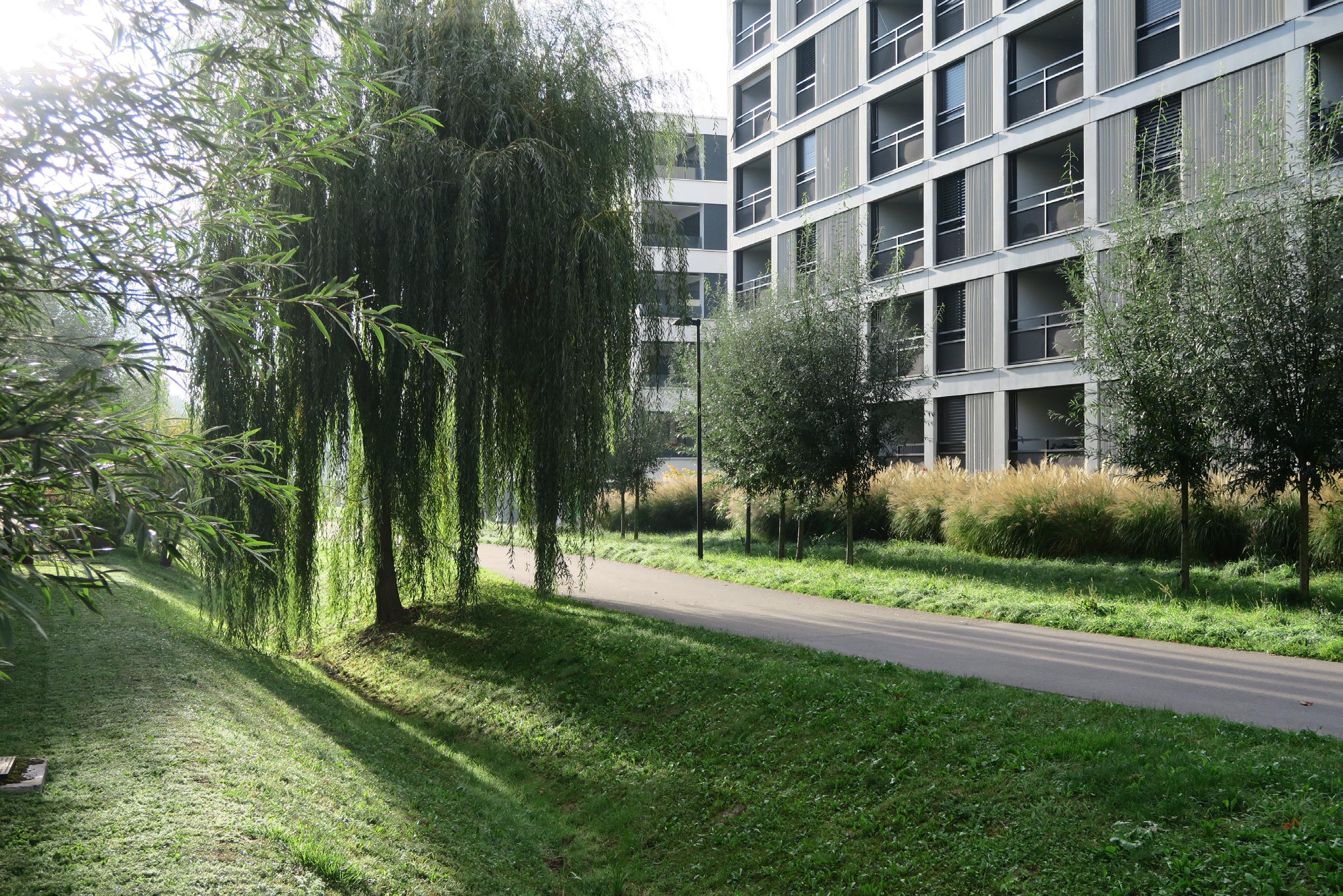 Unser Entwurf umschliesst mit einem Kranz aus blühenden, kleinkronigen Bäumen harmonisch eine zentrale, offene Rasensenke. Die dichte Üppigkeit des Hains schafft einen wohltuenden Gegenpol zur offenen Weite der Lichtung. Durch den markanten Massstabssprung der niedrigen Bäume vor den grossflächigen Gebäudefassaden verleihen wir dem Park einen eigenständigen Horizont. Die kleinkronigen Bäume gewährleisten, dass die schöne Aussicht aus den Wohnun-