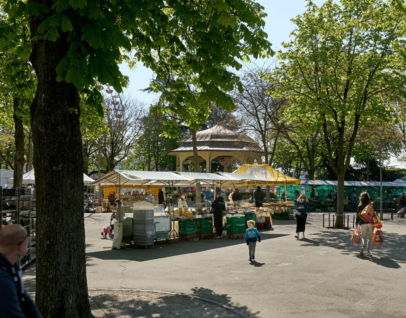 angeordnet, dass die diversen Märkte im lichten Schatten abgehalten werden können. Die verschiedenen Baumarten unterstreichen die bunte städtische Atmosphäre des Ortes und lassen weiterhin die Sicht auf den See zu. Inmitten eines verkehrsreichen Stadtraums ist ein angenehmer Aufenthaltsort entstanden, von dem die Aussicht über den Zürichsee und auf das Alpenpanorama genossen werden kann.