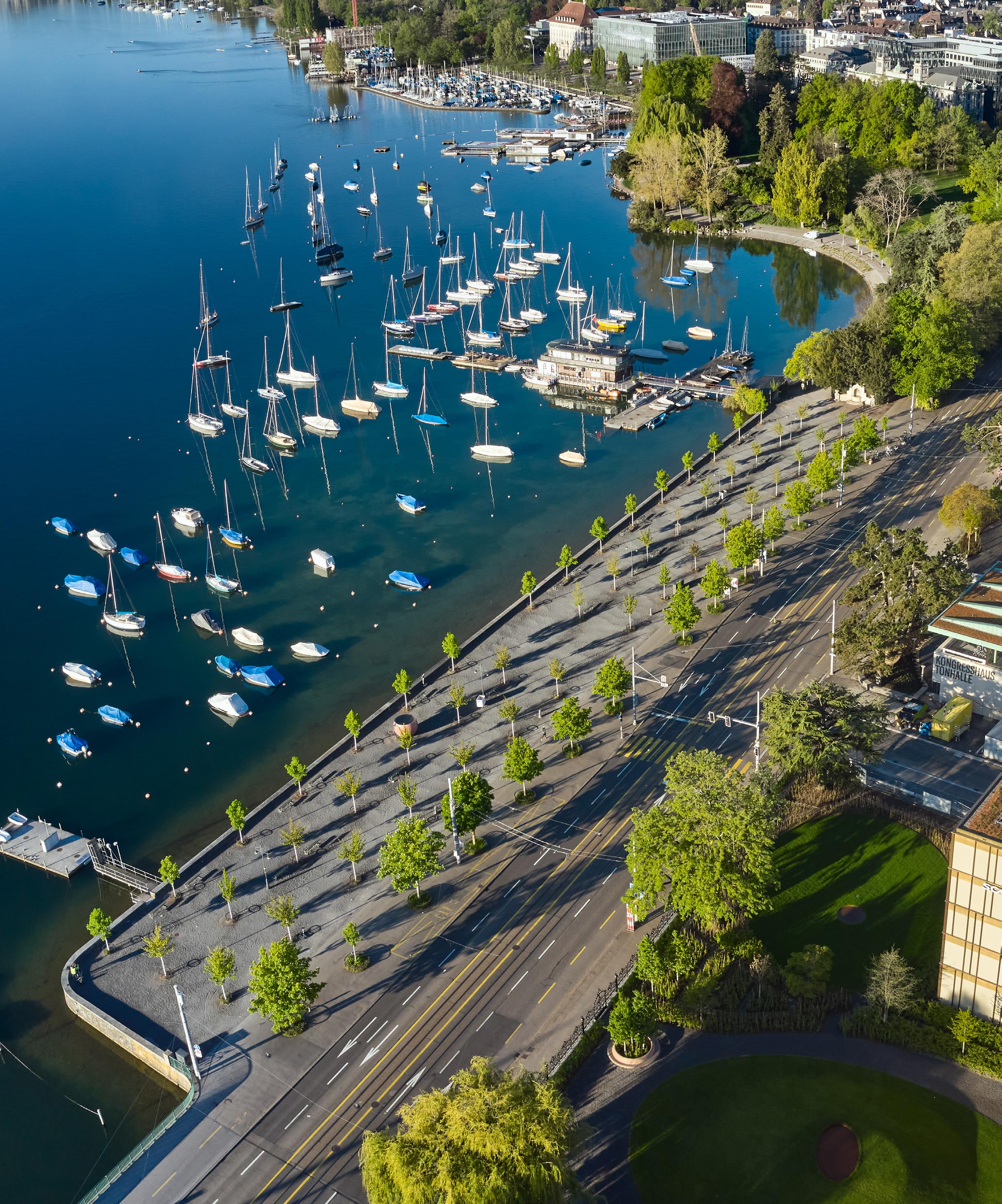 Die Quaianlagen am unteren Seebecken sind eine bedeutende Sehenswürdigkeit Zürichs und wurden 1887 auf einer Seeaufschüttung eingeweiht. Wir haben einen wesentlichen Teil der beeindruckenden Perlenkette aus unterschiedlichen Platz- und Parkbereichen fein auf die intensiven Nutzungen abgestimmt. Die Uferbereiche am unteren Seebecken des Zürichsees sind eine der Hauptattraktionen der Limmatstadt. Die Quaianlagen entstanden seit 1833 auf Seeaufschüttungen und wurden 1887 eingeweiht. Die wie Perlen an dieser Kette liegenden Platz- und Parkbereiche haben Zürich zum See hin geöffnet, während gleichzeitig wichtige Verkehrsachsen am Ufer entlang führen. Heute ist die Platz- und Parkfolge ein wertvolles Gartendenkmal und leistet einen unverzichtbaren Beitrag zur Freiraumversorgung der Stadt Zürich. An der Mündung der Bahnhofstrasse bilden Bürkliplatz, Bürkliterrasse und Stadthausanlage das zentrale Scharnier zwischen See und Limmat. Mit einem neuen Verkehrskonzept konnten wir unter Verlegung der Blumenuhr die mehrfach umgestaltete Platzabfolge in ihren ursprünglichen Abmessungen beibehalten. Gleichzeitig wurden sichere Radwege geschaffen. Unser Konzept für die Stadthausanlage lässt durch ein Raster aus zehn verschiedenen Baumarten eine grosszügige grüne Baumhalle entstehen. Die alten Baumexemplare, die die ursprünglich geschwungenen Wege begleiteten, konnten dabei erhalten werden. Wir haben die neuen Bäume so
