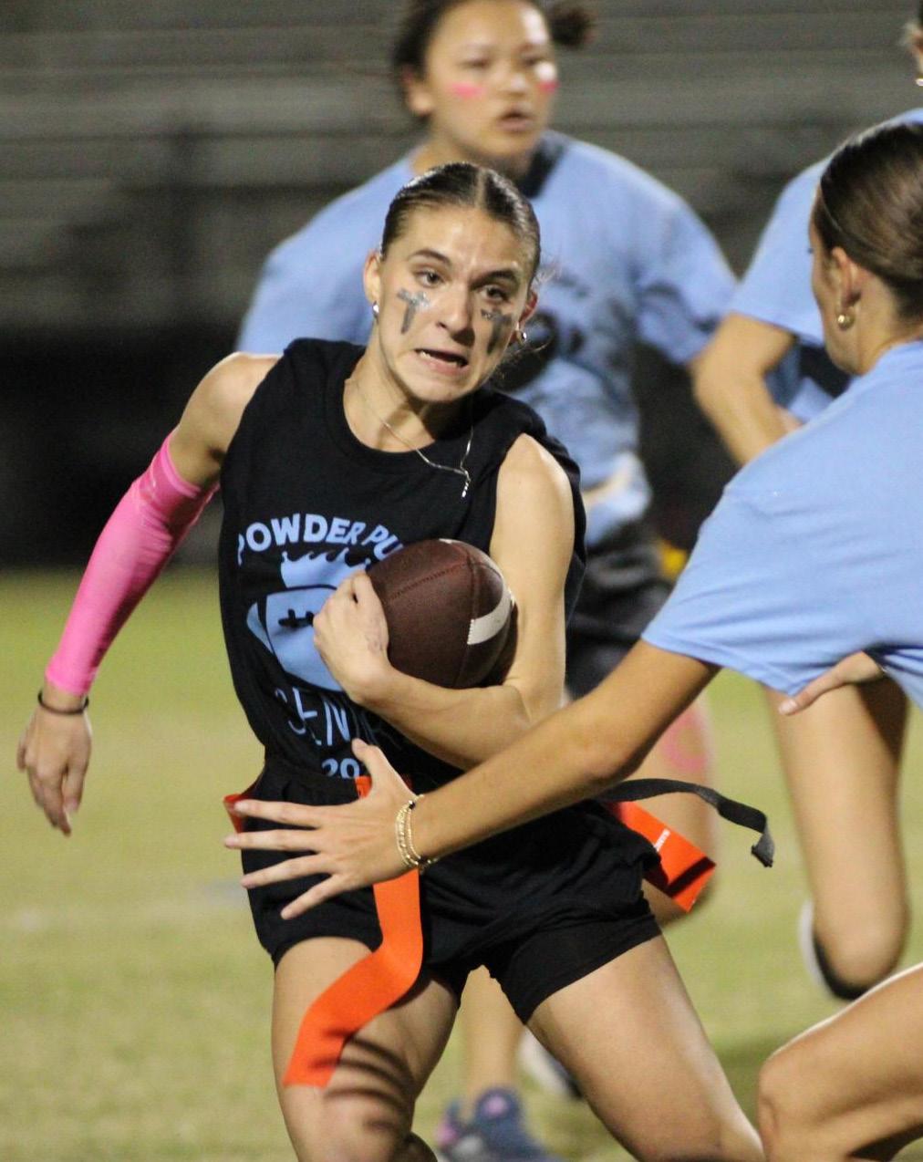 During the second quarter of Tuesday’s powderpuff football game, senior Olivia Cachat scored a 40yard field goal against the juniors. The seniors kept steady scoring all game, winning 30-0. The powderpuff game is an annual event that many students look forward to, where the senior girls go against the junior girls in a flag football game while the boys perform cheer leading stunts and rout routines on the sidelines. The class of 25’ is one of two classes to win two years in a row.